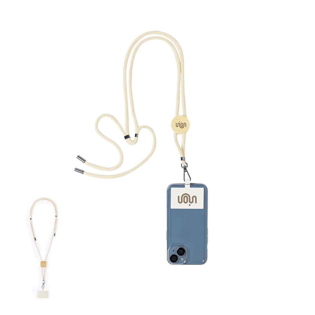 Original lanyard con accesorio para smartphone. Fabricado en resistente algodón, con accesorio de bambú para marcaje. Accesorio de transporte para situar entre la funda y el smartphone y mosquetón giratorio metálico. Ajustadores en cuello, con accesorios cromados en los extremos de los cordones de ajuste.Materiales como el bambú fomentan la utilización de materias primas naturales, reduciendo las emisiones contaminantes. Proviene de una planta de gran resistencia y versatilidad, con crecimiento y regeneración rápidos, siendo una excelente alternativa al uso de madera tradicional.
