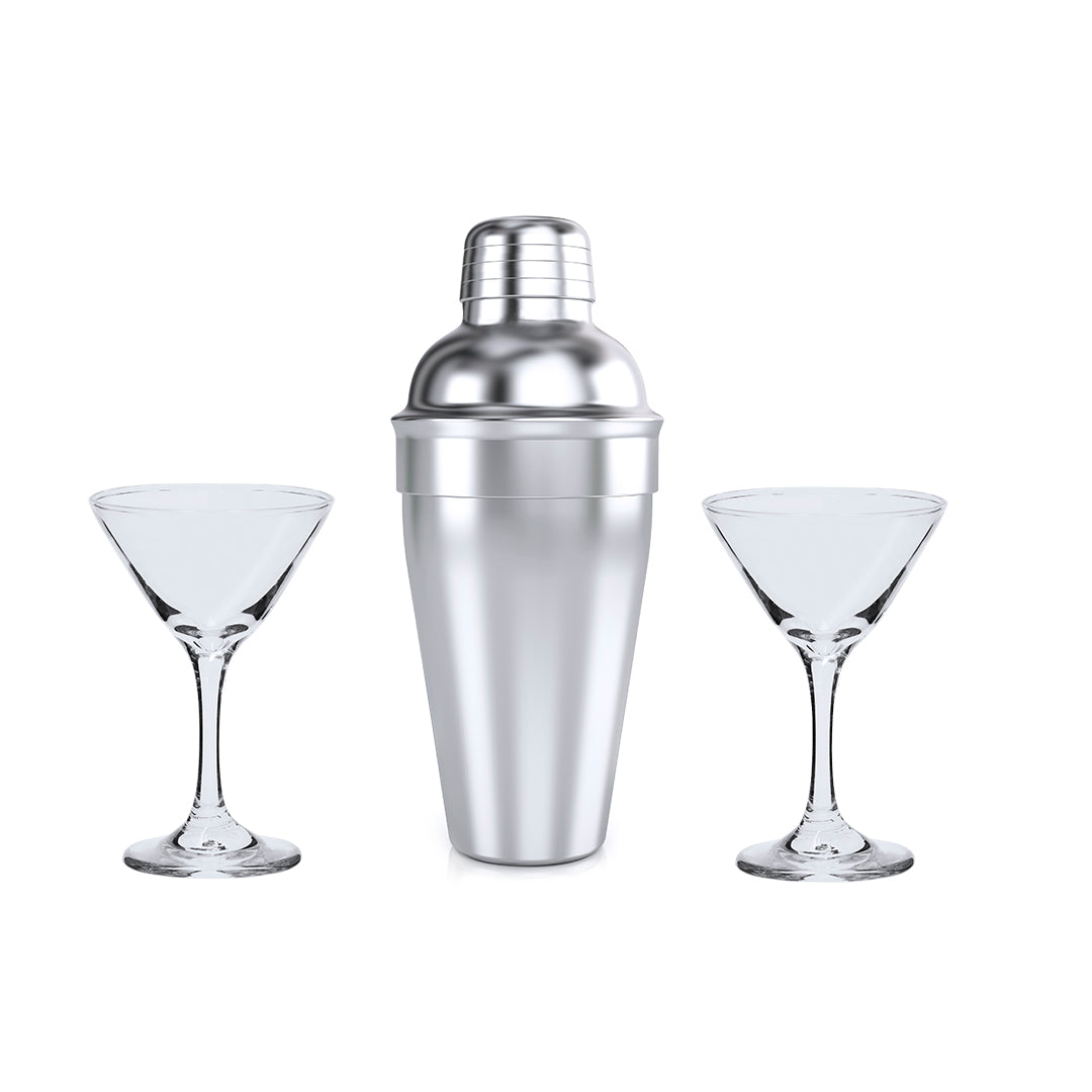 Elegante set de coctel. Conjunto de coctelera en acero inox de 550 ml para preparar las mejores mezclas de bebidas. Además, contiene 2 copas de cristal de 150 ml cada una y de elegante diseño triangular, para una presentación exquisita. Presentado en caja negra.