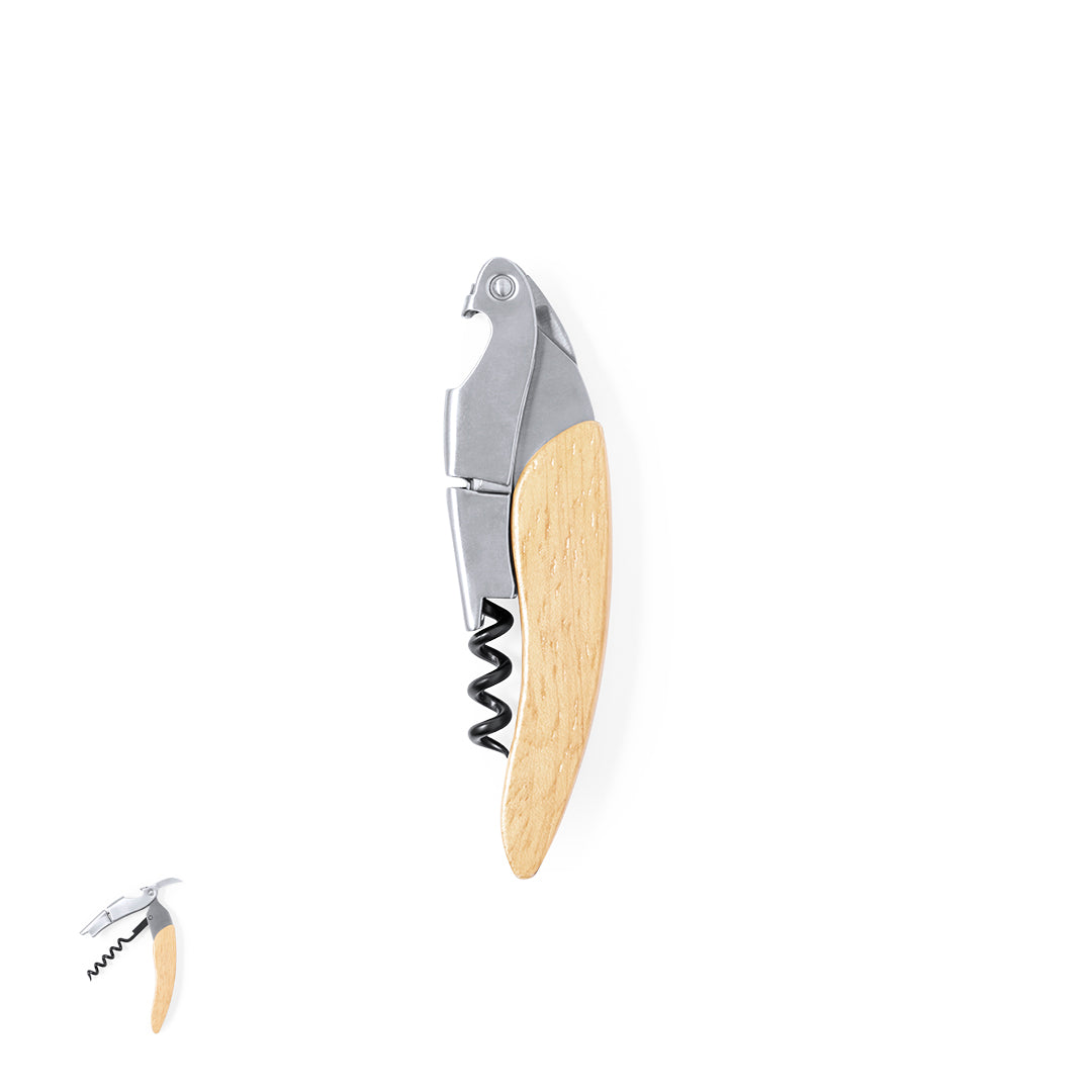 Sacacorchos fabricado en acero inox, con mango en suave madera y cortacápsulas integrado. Presentado en caja individual de diseño kraft.