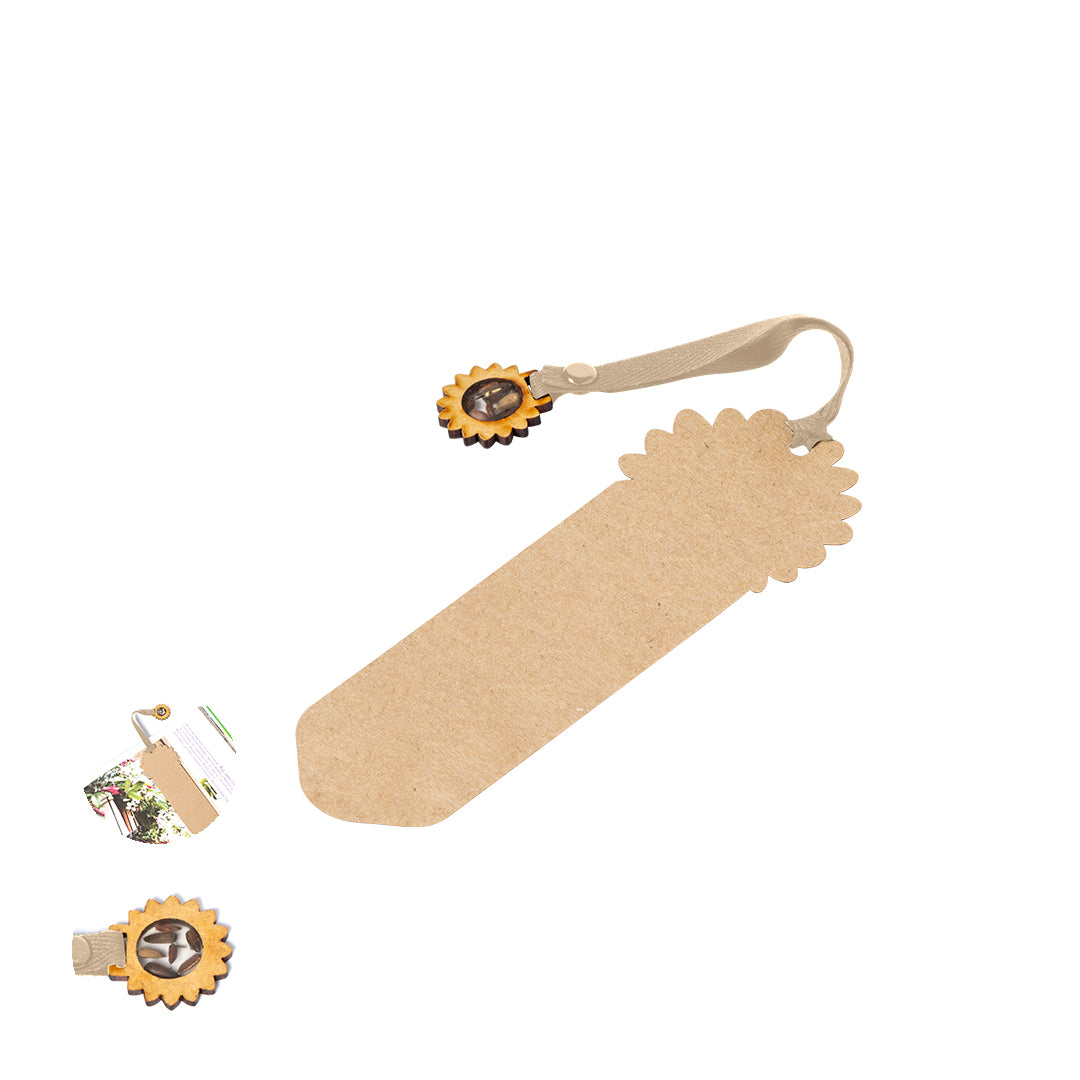 Práctico marcapáginas elaborado en cartón reciclado, con un diseño en forma de flecha y un cordón negro que facilita la búsqueda. En el extremo del cordón, incorpora una original cápsula con semillas de girasol.El cartón reciclado proviene del reaprovechamiento de excedente de fabricaciones y reciclaje de papel en el final de su vida útil, convirtiéndose en un lienzo ecológico y sostenible.