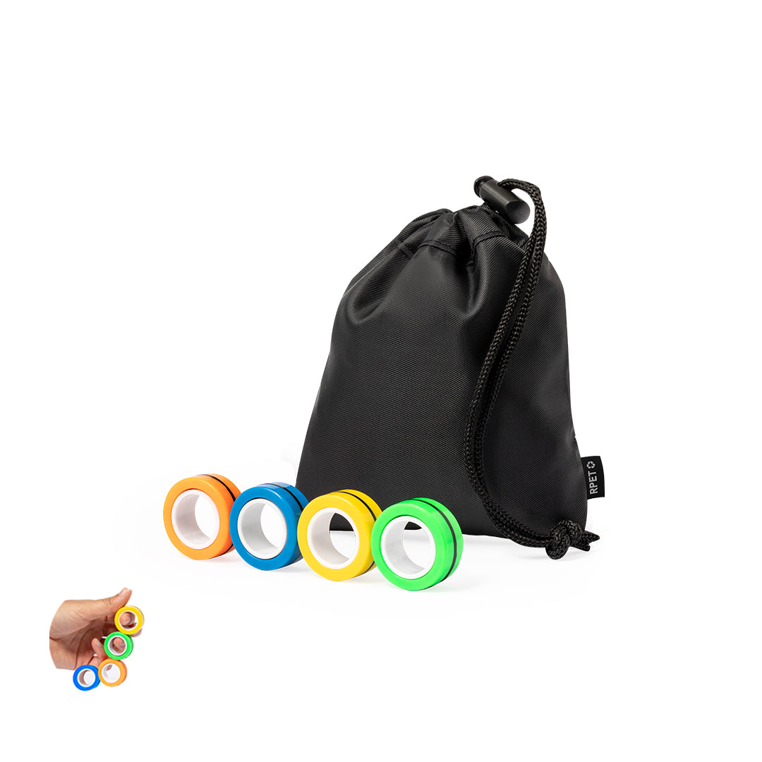 Original antiestrés en forma de anillos. Cuenta con cuatro piezas de colores con imanes para poder juntar y separar tantas veces como se quiera, liberando tensión gracias a su característico movimiento circular. Además, ofrecen la posibilidad de usarlos como spinner, ya sea juntos o por separado. Presentado individualmente en bolsa reciclada de RPET.