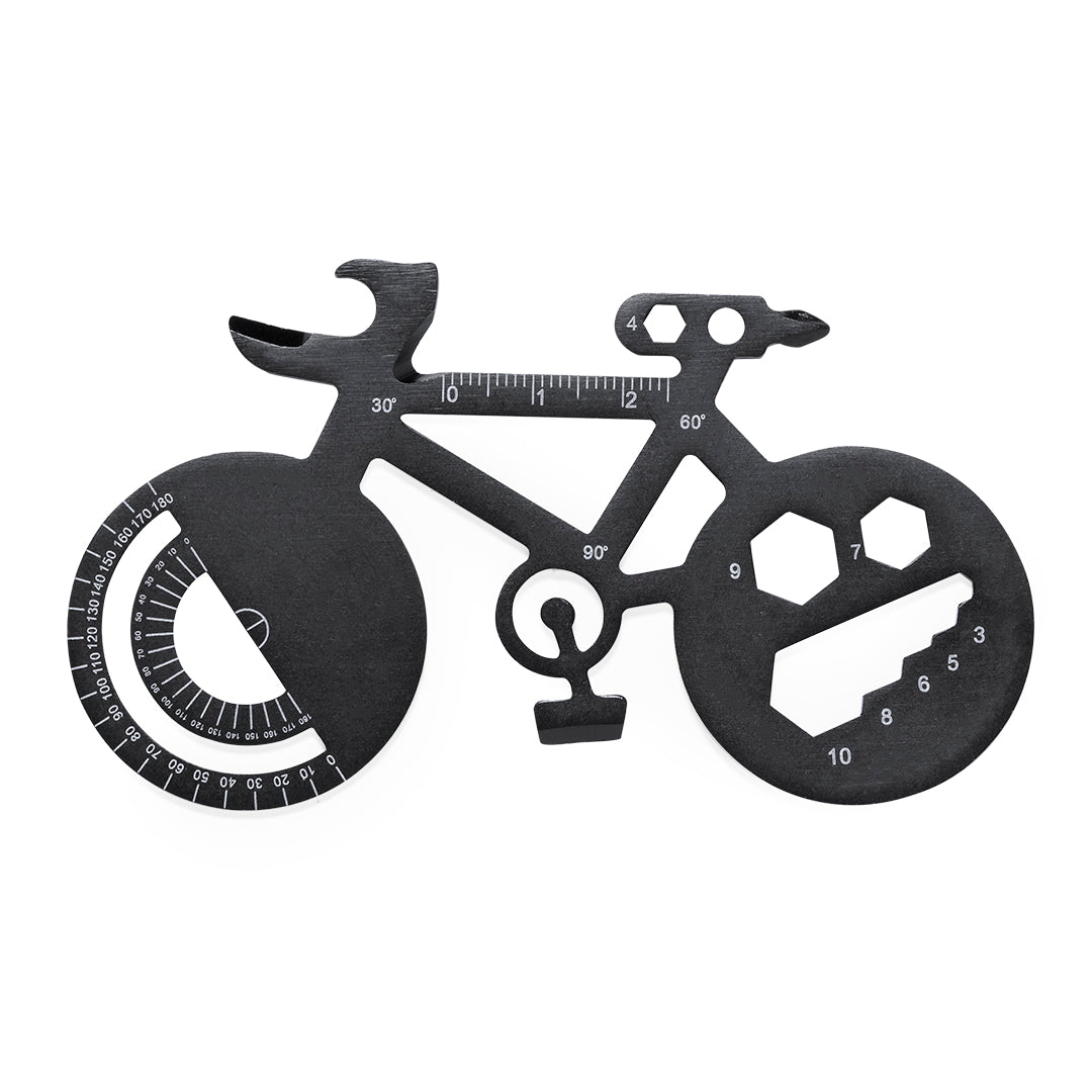 Original y práctica multiherramienta en acero inox con forma de bicicleta. Con 16 funciones, entre otras: destornillador de punta plana y philips, llave para tuercas hexagonales en varios tamaños, regla, transportador de ángulos y abrebotellas. Presentada en bolsa de papel reciclada.