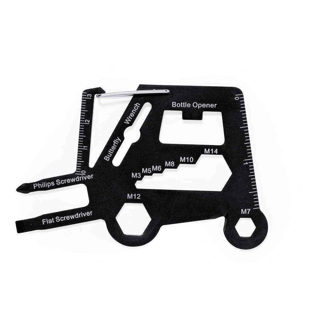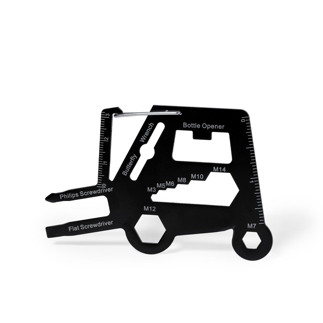 Original y práctica multiherramienta en acero inox con forma de toro mecánico. Con 16 funciones, entre otras: destornillador de punta plana y philips, llave para tuercas hexagonales en varios tamaños, regla, abridor de cajas y abrebotellas. Además de enganche en forma de mosquetón para un fácil transporte. Presentado en bolsa de papel reciclada.
