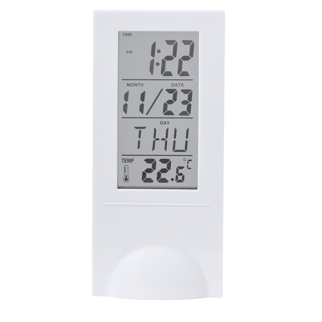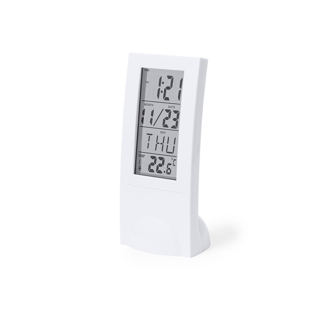 Estación meteorológica fabricada en resistente ABS, con sensor de temperatura. Función de hora (12/24), calendario, alarma y día de la semana. Con base soporte y botones de control traseros. Alimentación a pilas (2xAAA no incluidas) y presentada en atractiva caja de diseño kraft. Disponible manual de instrucciones en español e inglés.