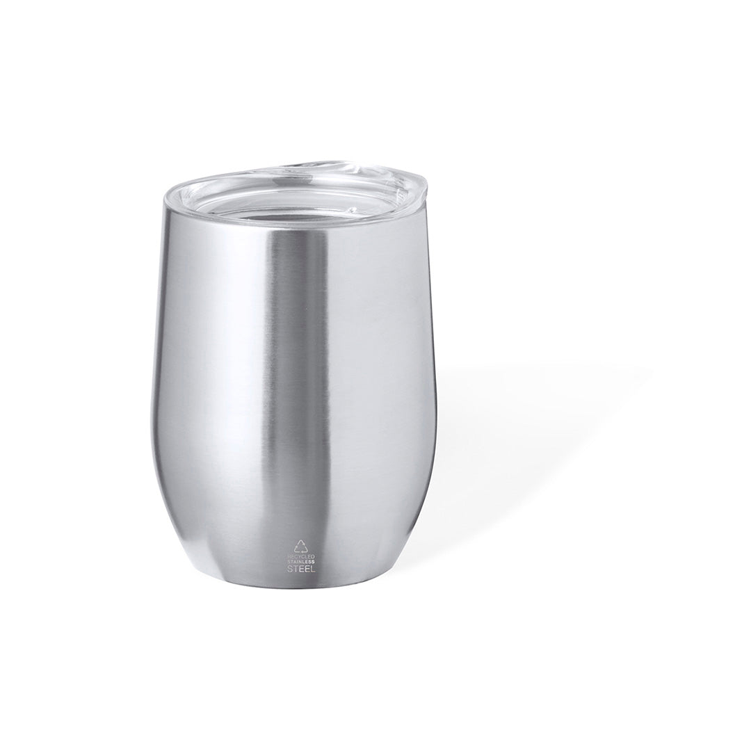 Vaso térmico fabricado en acero inox reciclado, con doble pared y 340 ml de capacidad. Incluye tapa transparente con cierre a presión y dosificador. Es ideal para tener en tu escritorio, mesa o en cualquier superficie donde disfrutar tranquilamente de tu bebida favorita. Con logotipo Acero Inox Reciclado. El acero es uno de los materiales más demandados y que puede encontrarse casi en todas partes, desde productos de uso diario a grandes construcciones. Con innumerables propiedades, entre las que cabe destacar la durabilidad y su alto grado de reutilización, convirtiéndolo en una alternativa muy valorada en soluciones de sostenibilidad. Debidamente tratado, permite obtener nuevos recursos de infinita utilización.