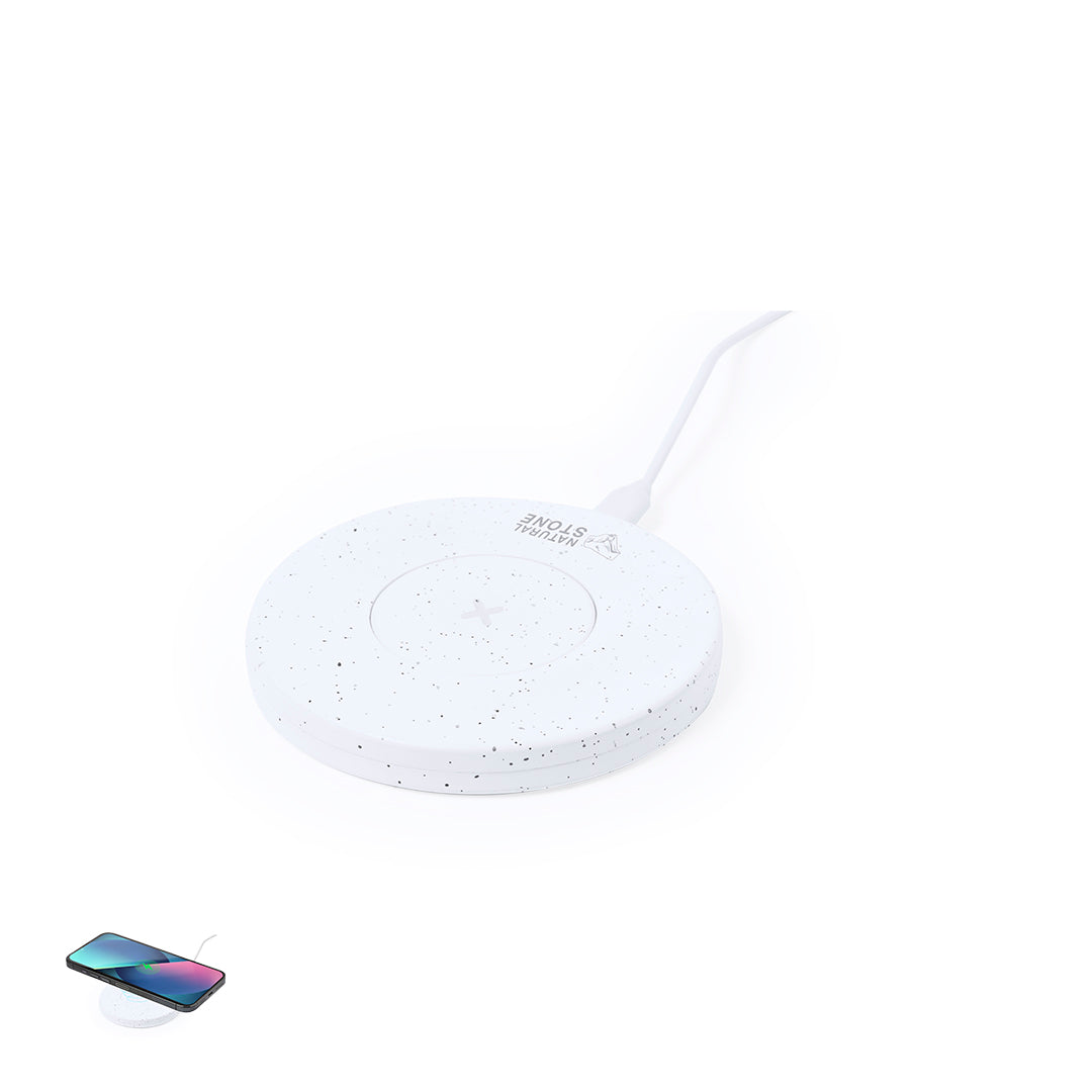 Cargador inalámbrico circular 15W, fabricado a partir de extractos de piedra natural en combinación con resistente ABS. Base antideslizante e indicador LED de estado de carga. Cable Tipo C incluido y compatible con smartphones con tecnología de carga inalámbrica. Presentado en atractiva caja de diseño kraft.Fabricado con extractos de piedra natural, ayudando a la reducción del uso de plásticos, además de proporcionar un acabado suave y resistente.Fabricado conforme a los estándares RoHS y en cumplimiento con los siguientes requisitos de seguridad:Sistema de protección contra sobrecalentamiento.Sistema de protección contra sobrecarga.Sistema de bloqueo para evitar cortocircuitos.