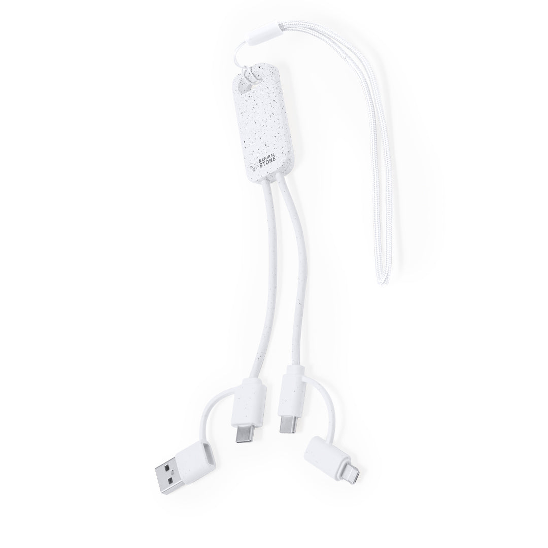 Cable cargador fabricado a partir de extractos de piedra natural en combinación con resistente ABS. Con conexiones de entrada Tipo C/USB y salidas Tipo C, Lightning y Micro USB. 5V DC 2.4A. Presentado en caja individual de diseño kraft.Fabricado con extractos de piedra natural, ayudando a la reducción del uso de plásticos, además de proporcionar un acabado suave y resistente.