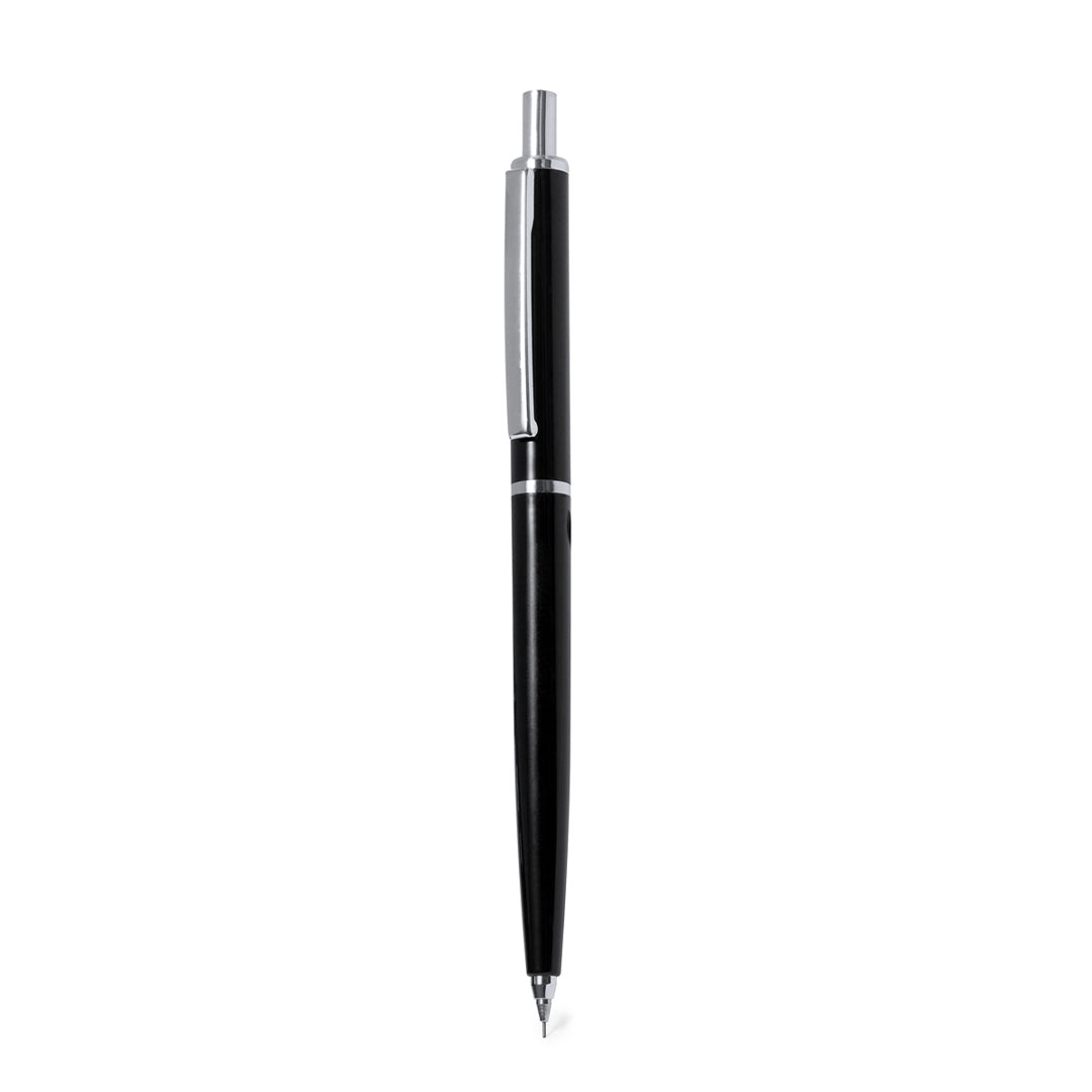 Elegante portaminas hecho en resistente ABS. Cuerpo en color negro y empuñadura a juego de tacto liso, con elementos cromados como botón, clip, punta y anilla central.Con goma y minas incluidas de 0,7 mm.