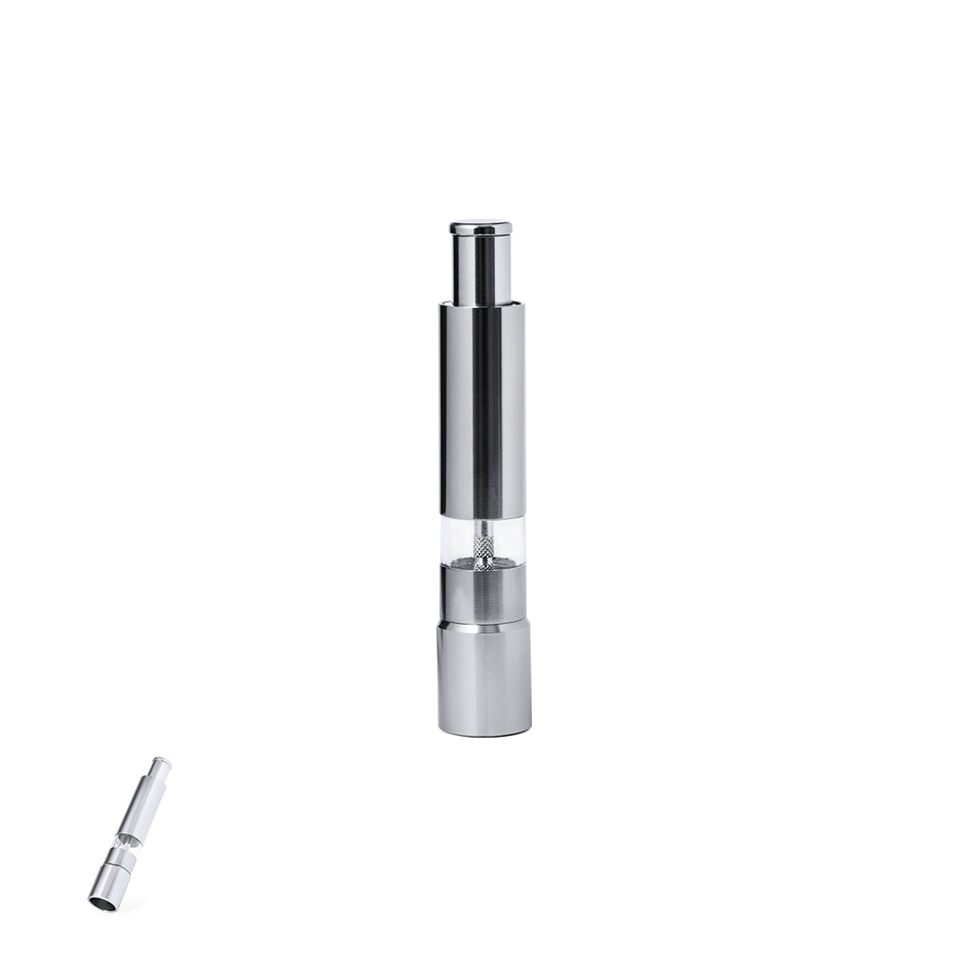 Molinillo manual para sal y pimienta fabricado en aluminio. Ideal para agregar la especia más deseada y utilizar con el picador manual en forma de pulsador. Cuenta con una ventana para visualizar el nivel. Presentado en caja de diseño kraft.