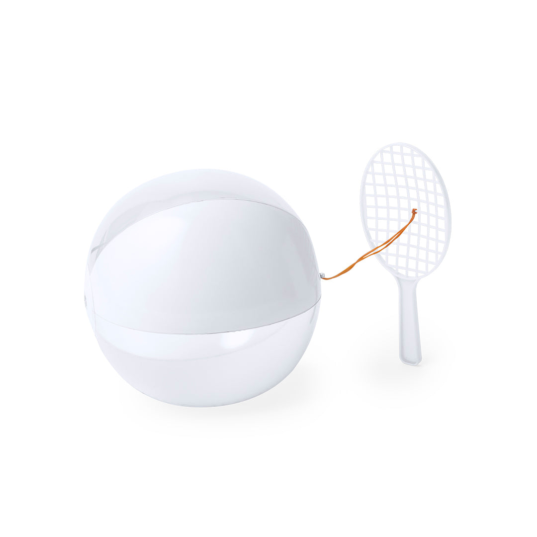 Divertido set de raqueta y balón con válvula de inflado en combinación de blanco y translúcido, unidos por un elástico. Presentado cada set en bolsa reciclada.