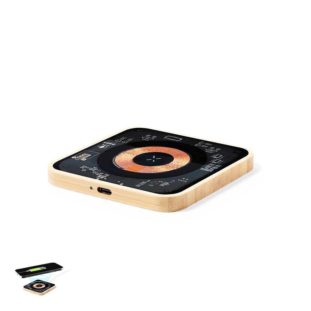 Cargador inalámbrico 15W de original diseño y superficie transparente que permite ver los componentes internos del dispositivo. Con base bambú cuadrada y compatible con dispositivos con tecnología Qi. Conexión Tipo C, con manual de instrucciones en español e inglés. Presentado en caja individual de diseño kraft.Materiales como el bambú fomentan la utilización de materias primas naturales, reduciendo las emisiones contaminantes. Proviene de una planta de gran resistencia y versatilidad, con crecimiento y regeneración rápidos, siendo una excelente alternativa al uso de madera tradicional.Fabricado conforme a los estándares RoHS y en cumplimiento con los siguientes requisitos de seguridad:Sistema de protección contra sobrecalentamiento.Sistema de protección contra sobrecarga.Sistema de bloqueo para evitar cortocircuitos.