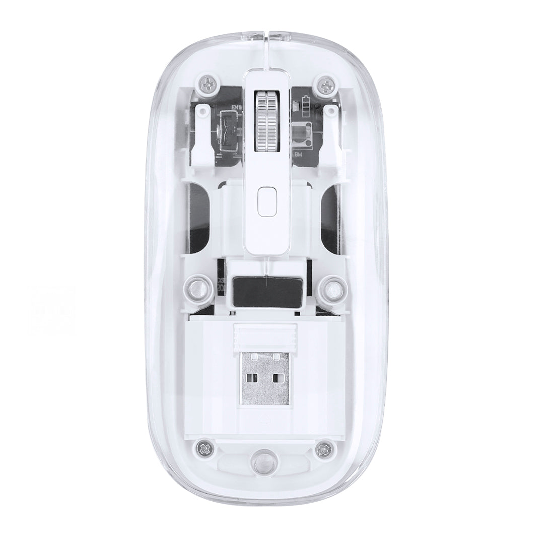 Ratón óptico inalámbrico de original diseño, con cuerpo transparente que permite ver los componentes internos del dispositivo. Con batería integrada de 300 mAh y con puerto de carga Tipo C (cable incluido). Incluye botón DPI, con conexión “plug and play” por USB y viene presentado en caja individual de diseño kraft.