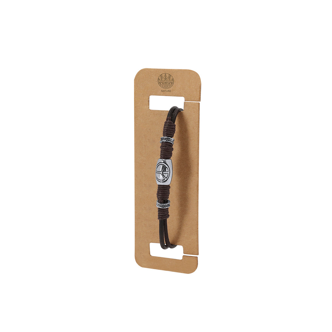 Pulsera de piel marrón adornada con cordones de algodón encerados a juego y abalorios plateados, incluyendo un charm con el símbolo de la paz. Cuenta con un original cierre de aleación de zinc en tono plateado. Presentada en cartón kraft con superficie lisa para el marcaje.