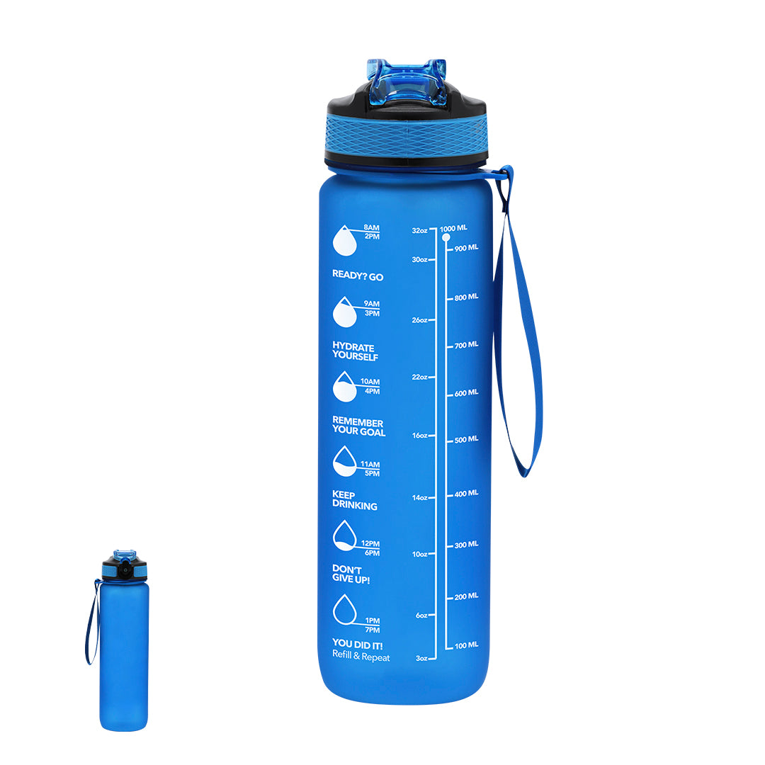 Bidón de 1L de capacidad, fabricado en resistente PETG y en acabado translúcido mate.Con indicador de capacidad en litros y onzas, junto con frases motivadoras que invitan a mantener una adecuada hidratación. Con tapón negro de rosca. Incluye dosificador con cierre de seguridad y cómoda cinta de transporte. Libre de BPA.