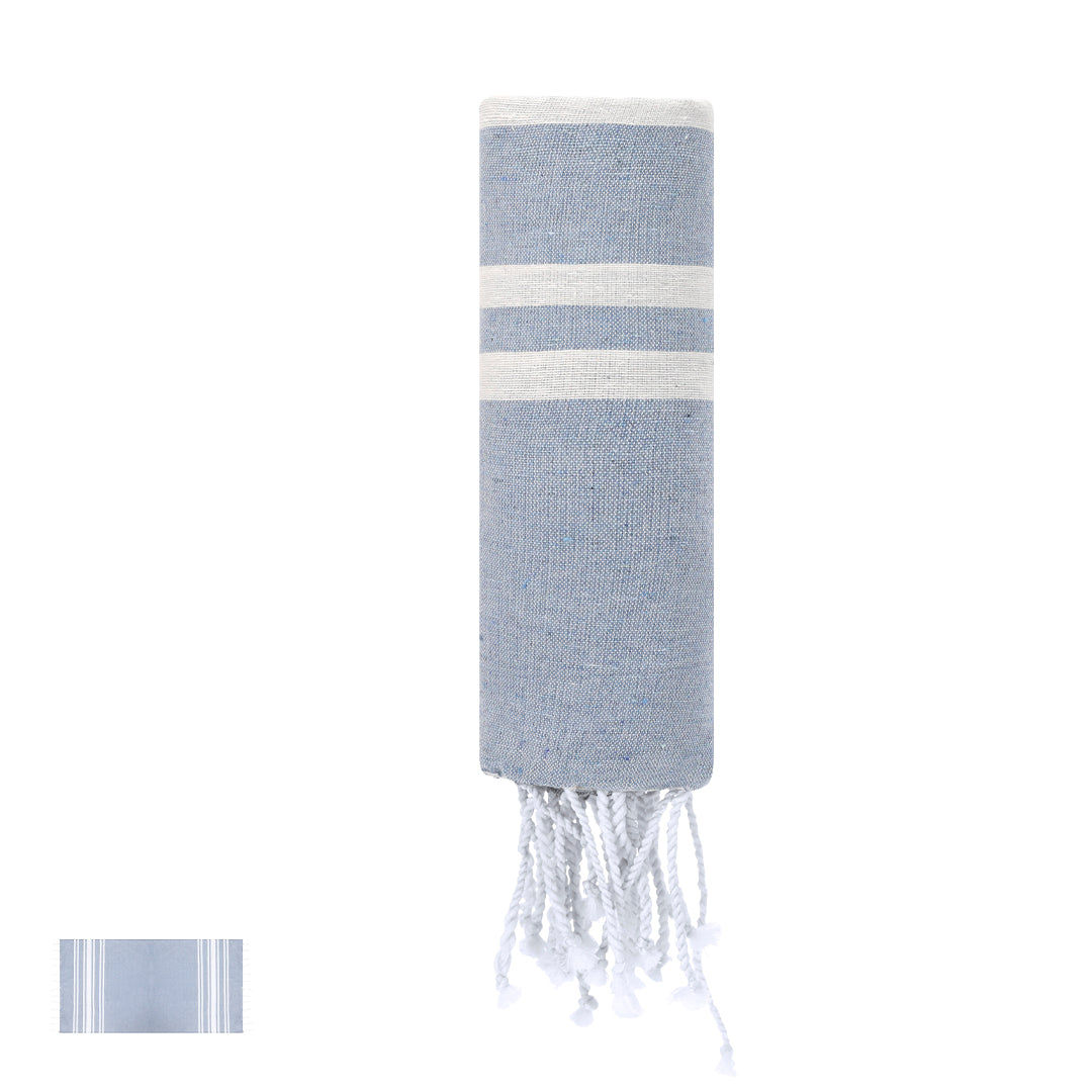Suave pareo-toalla de 150g/m2 en combinación de algodón y poliéster. Su diseño cuenta con una base en color y rayas blancas, .Incluye flecos en los extremos que añaden un detalle decorativo y que completan su acabado.