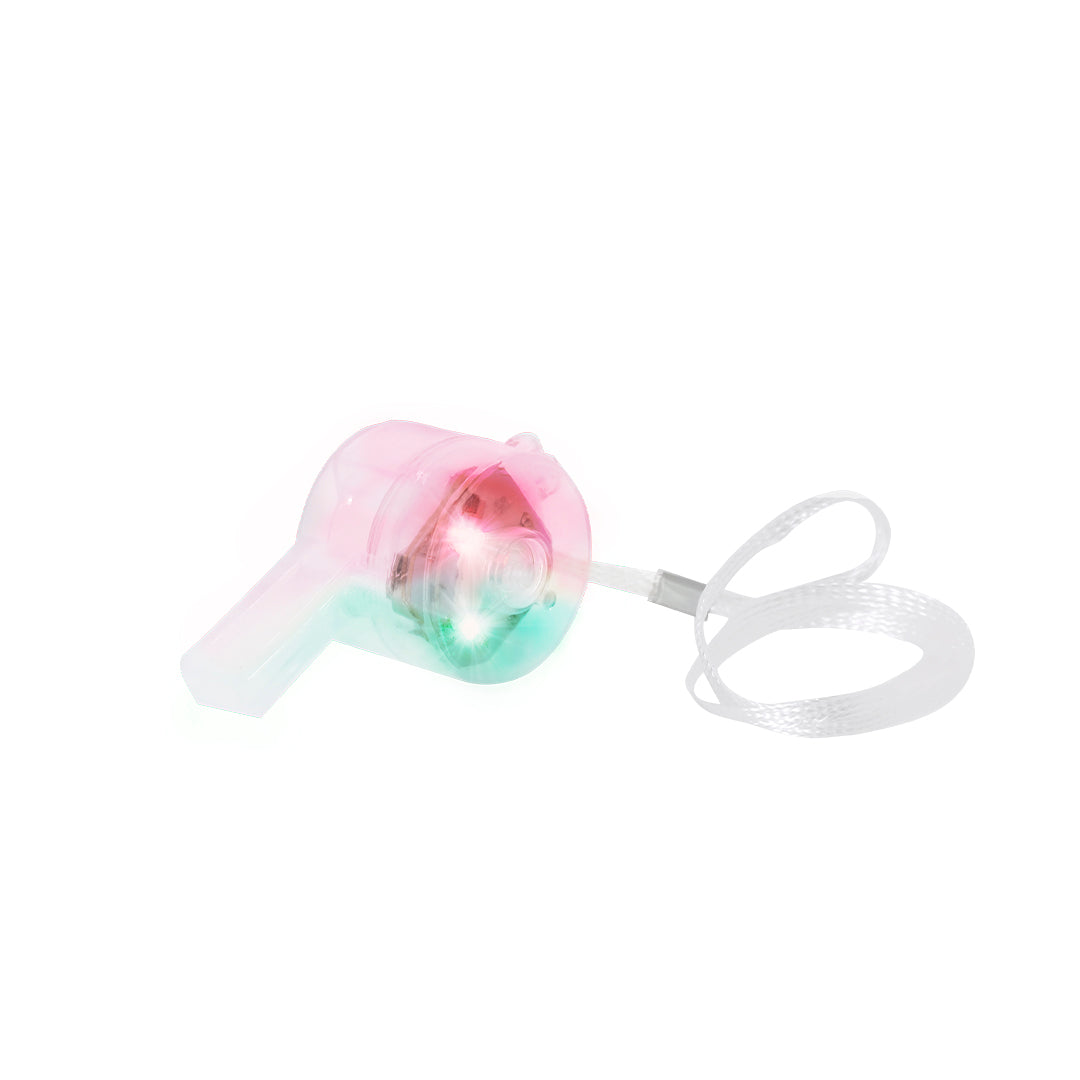Silbato luminoso con LEDs multicolor que ofrecen varias posiciones de iluminación: parpadeo lento, medio o rápido, adaptándose a diferentes ambientes. Incluye práctico botón de encendido/apagado. Incorpora cordón para un transporte cómodo y funciona con tres pilas de botón (incluidas).