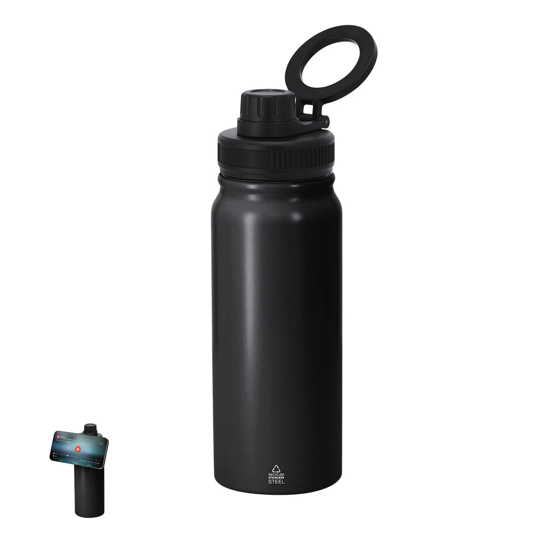 Bidón térmico de 600 ml de capacidad, fabricado en Acero Inox Reciclado de doble pared. Con función soporte magnético giratorio para smarthphone. Libre de BPA. Incluye distintivo de acero inoxidable reciclado.El acero es uno de los materiales más demandados y que puede encontrarse casi en todas partes, desde productos de uso diario a grandes construcciones. Con innumerables propiedades, entre las que cabe destacar la durabilidad y su alto grado de reutilización, convirtiéndolo en una alternativa muy valorada en soluciones de sostenibilidad. Debidamente tratado, permite obtener nuevos recursos de infinita utilización.