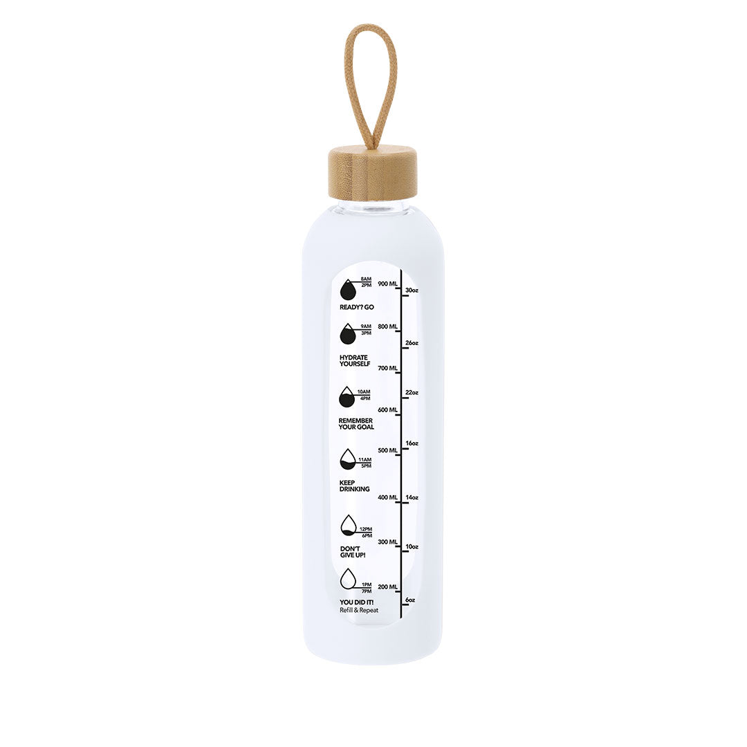 Bidón fabricado en cristal de 1L de capacidad, diseñado para fomentar una hidratación adecuada. Recubierto con funda de silicona que protege y proporciona un agarre cómodo y seguro.Incluye indicador de capacidad en litros y onzas, acompañado de frases motivadoras que inspiran a mantener una correcta hidratación diaria. Tapón, elaborado en bambú, incluye práctico cordón para facilitar su transporte. Libre de BPA.