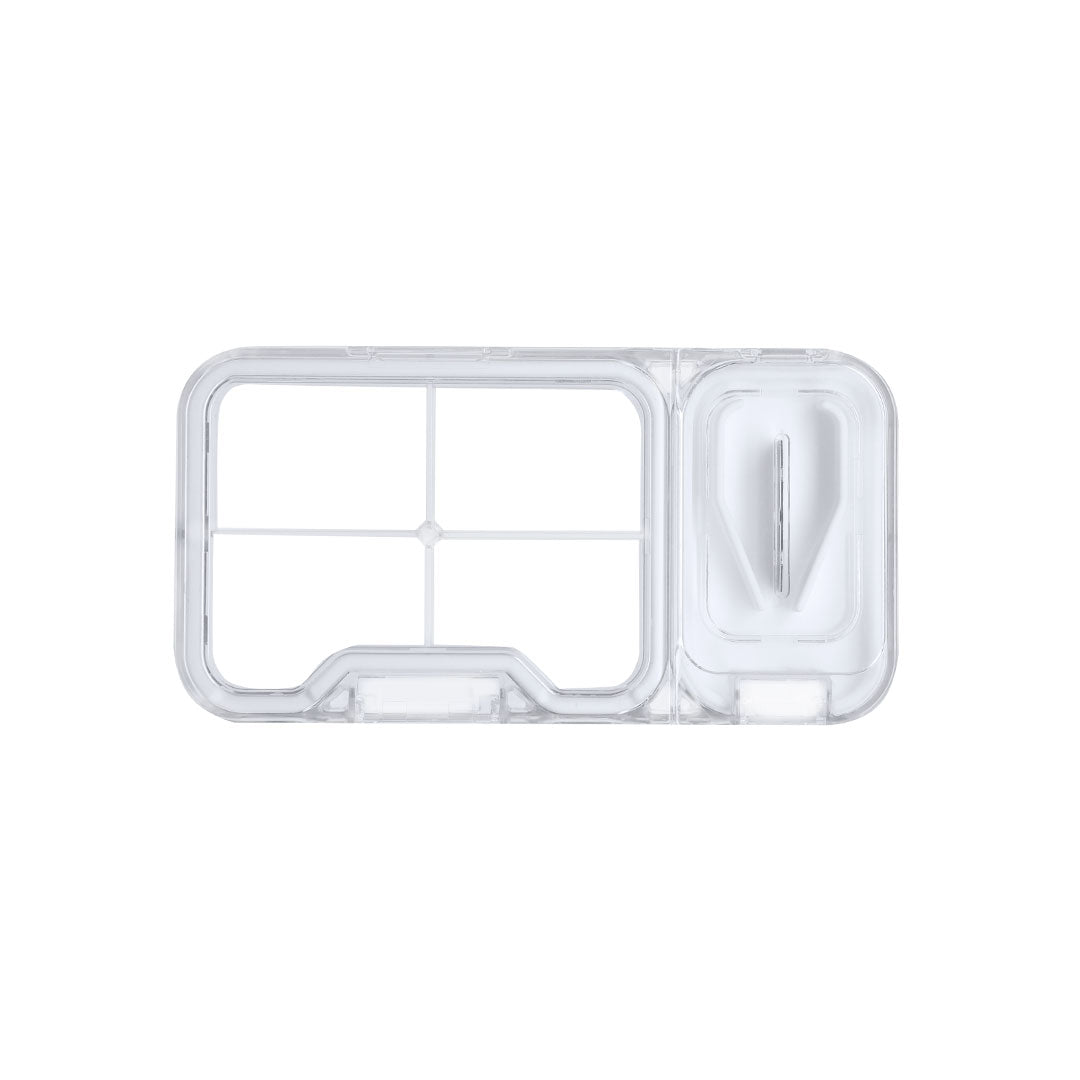 Pastillero con 4 compartimentos interiores, cierre de seguridad con bordes de silicona y cuchilla para partir pastillas. Fabricado con un acabado transparente.