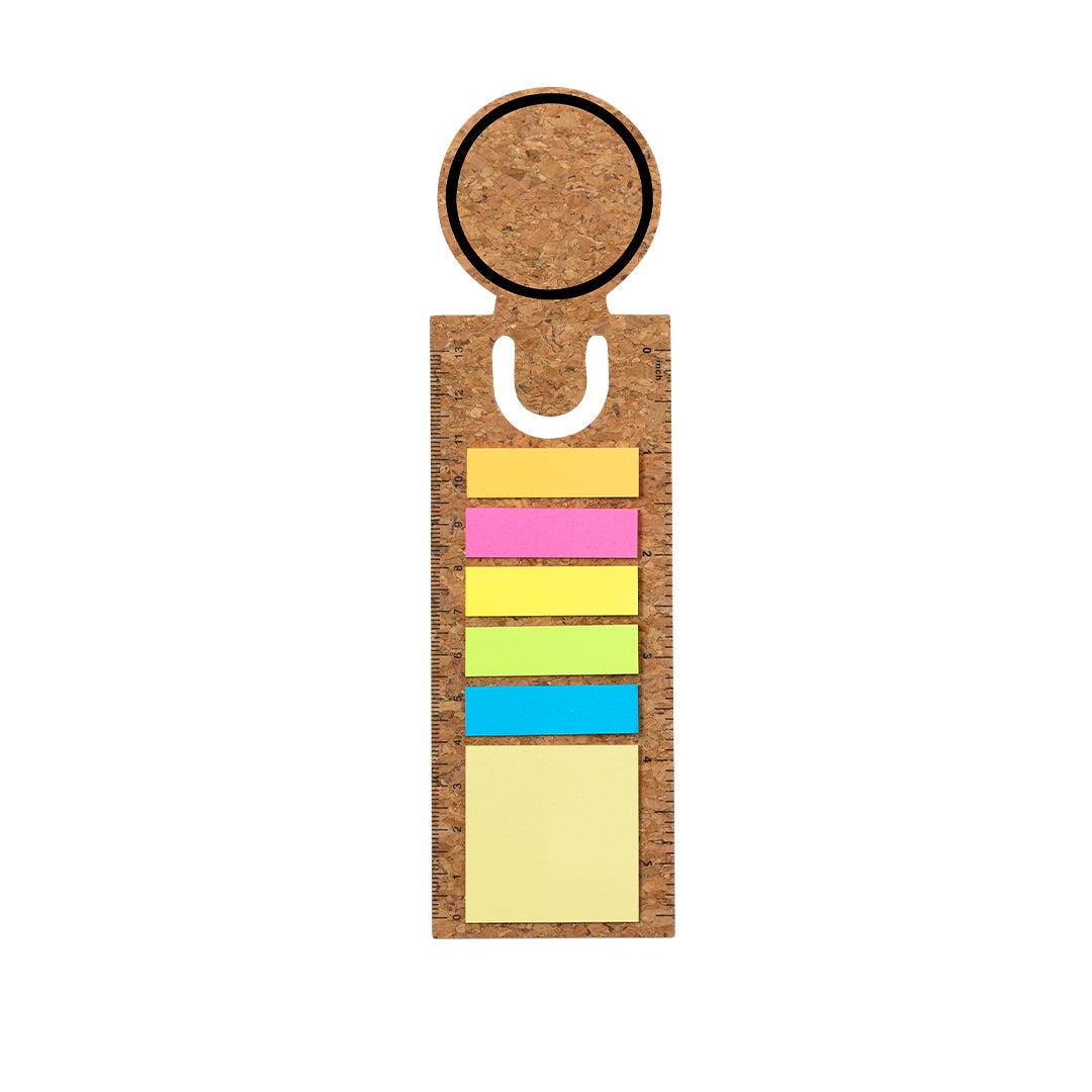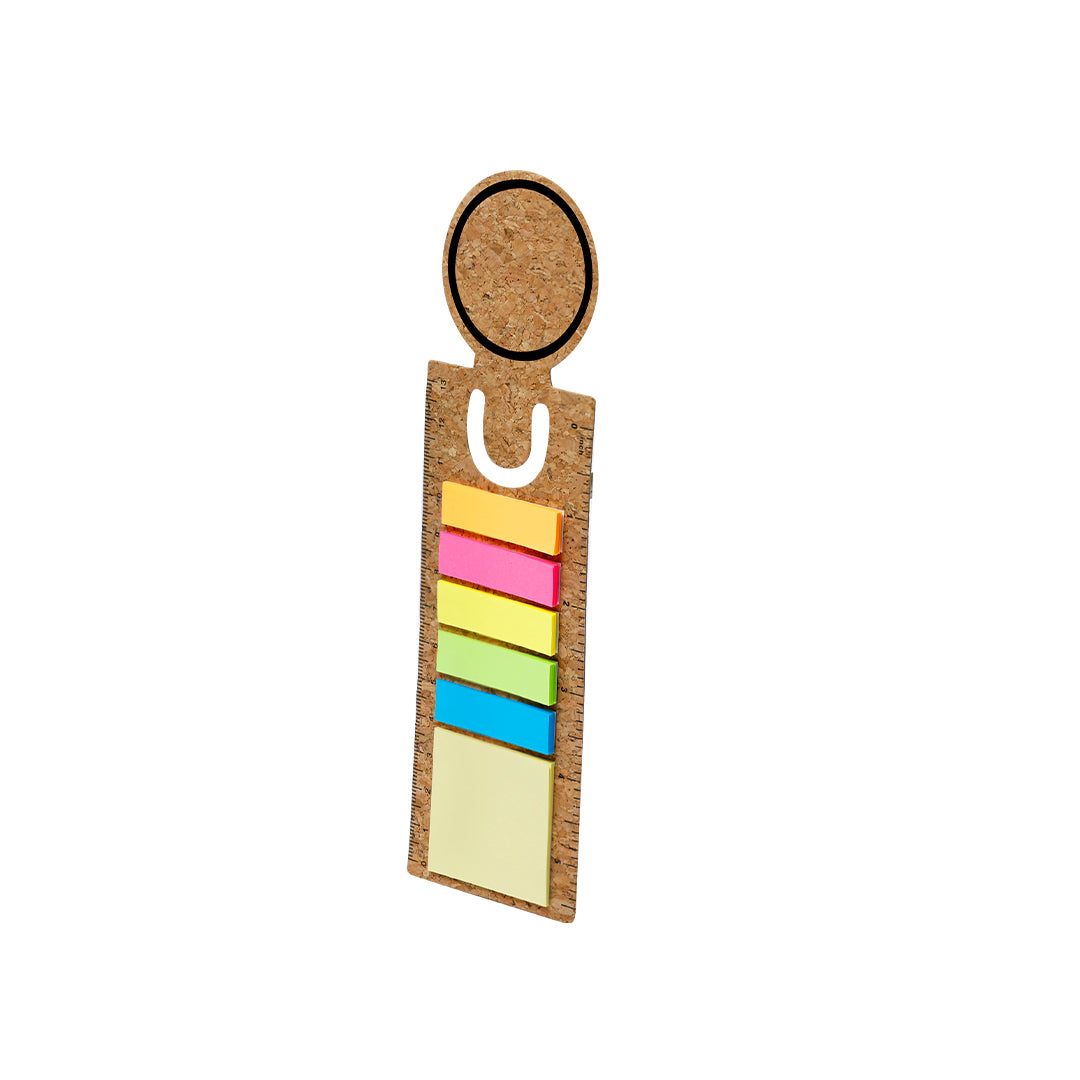 Regla marcapáginas de corcho con notas adhesivas. Incluye 90 notas adhesivas en variados colores y tamaños.Elaborado con elementos vegetales para así fomentar la utilización de materias primas naturales y reducir las emisiones contaminantes.