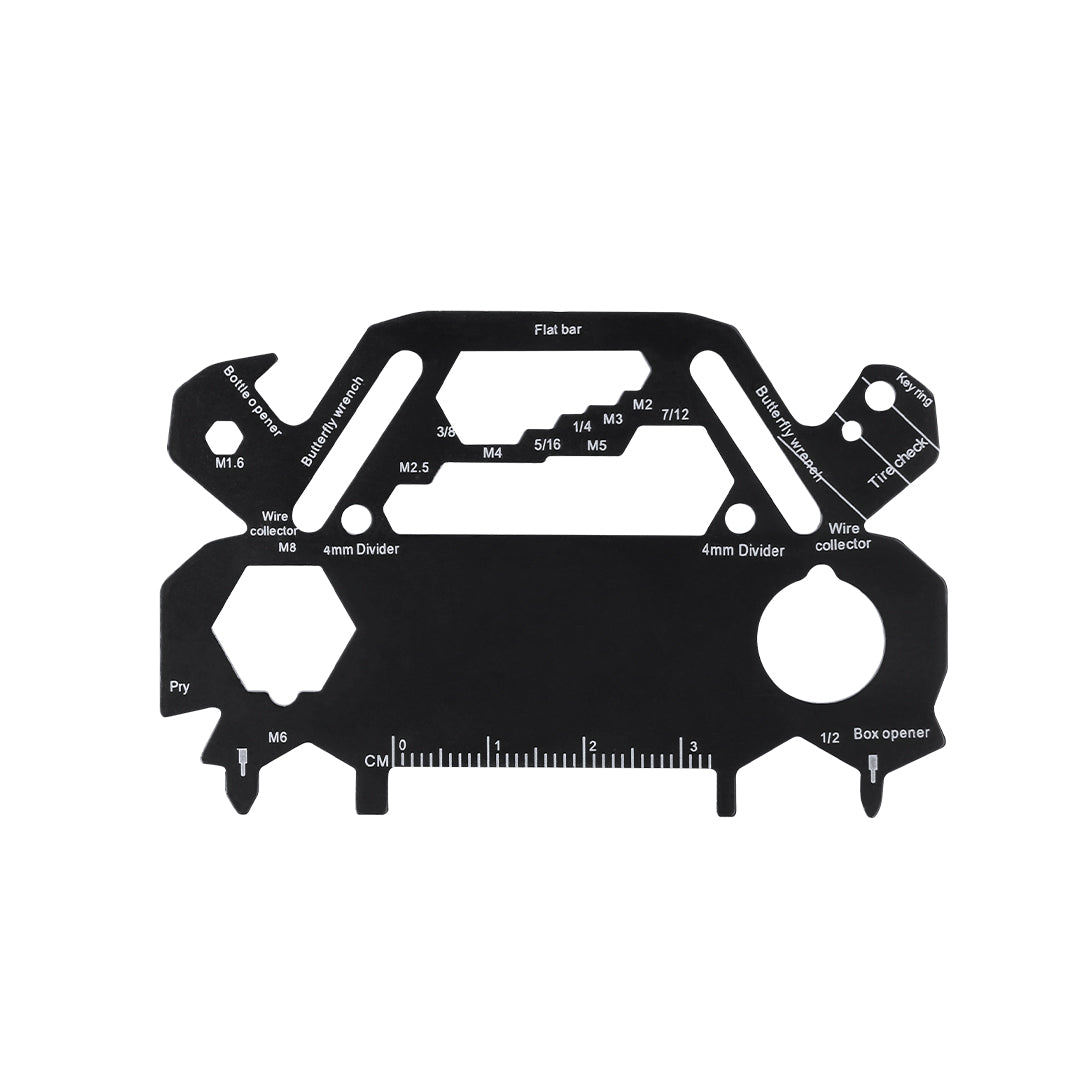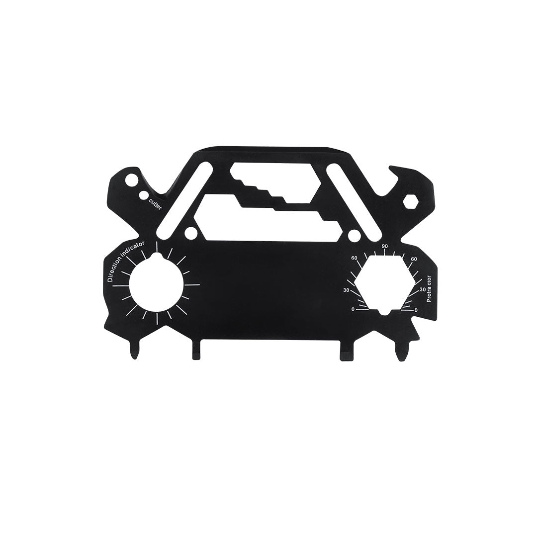 Original y práctica multiherramienta en acero inox con forma de coche. Con 30 funciones, entre otras: destornillador de punta plana y philips, llave para tuercas hexagonales en varios tamaños, regla y abrebotellas.