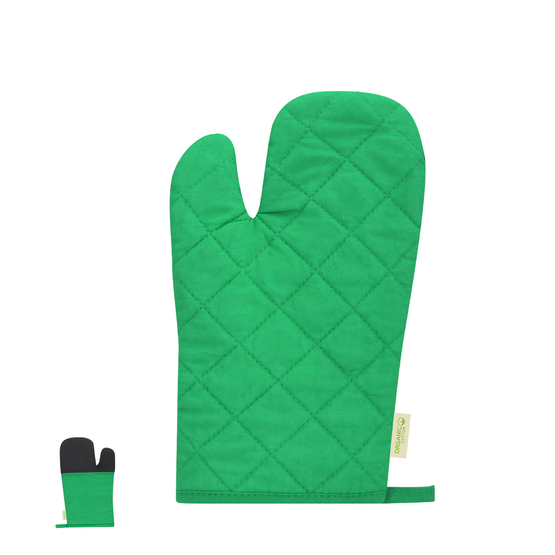 Manopla de algodón orgánico con recubrimiento de goma en la zona de agarre para mayor protección ante altas temperaturas. Incluye distintivo algodón orgánico.