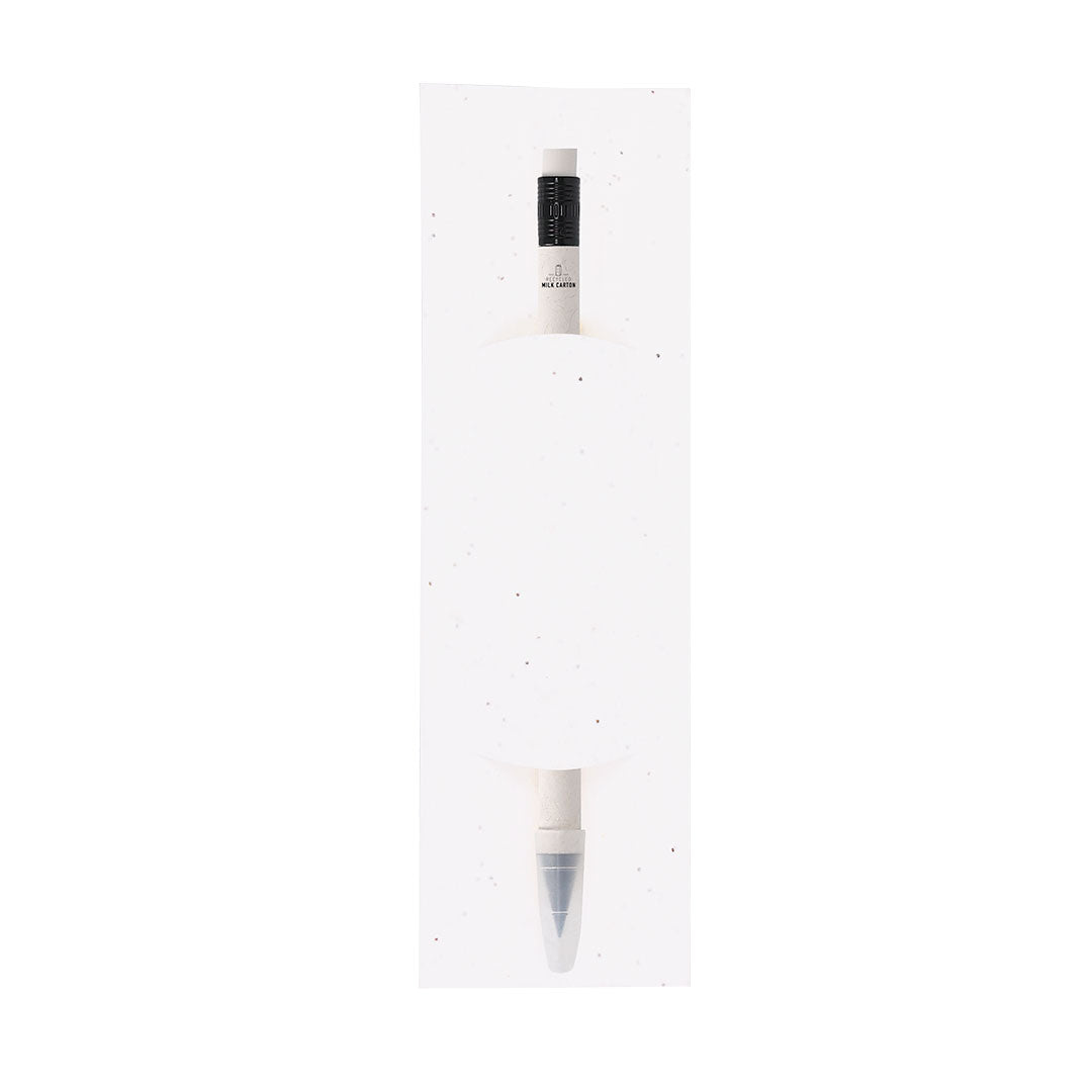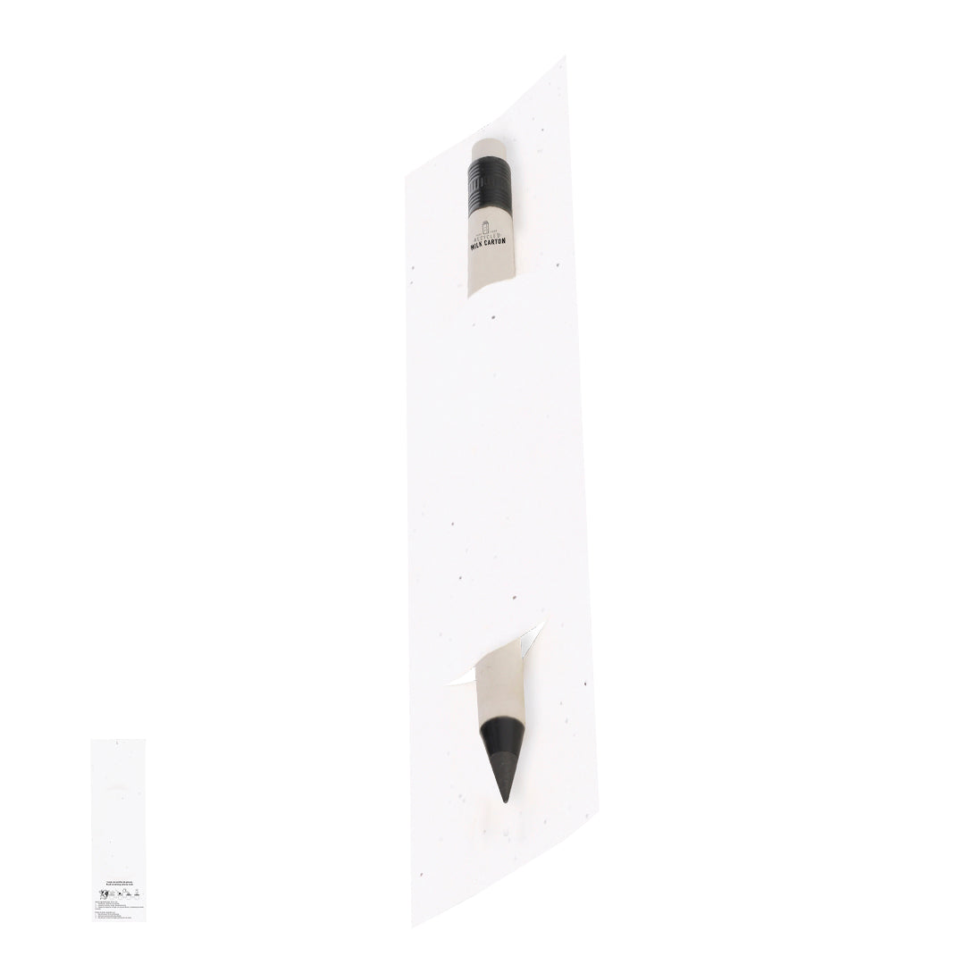 Lápiz eterno fabricado con cartones de leche reciclados, presentado en funda de papel con semillas. Reutilizable y con escritura infinita. Incluye goma de borrar en la parte superior del lápiz y capucha de protección. De color blanco, con detalles en negro. Con distintivo de cartón de leche reciclado en el cuerpo. La funda incluye semillas de petunia, convirtiéndolo en papel plantable al final de su vida útil. Incluye instrucciones de plantado en la cubierta trasera.Los Cartones de Ceche se componen en su mayor parte de cartón y aluminio. Durante su proceso de reciclado, se separan los distintos materiales del envase para su reutilización y nuevo uso, contribuyendo así a recorrer el camino infinito de la economía circular. Este material se caracteriza por su alto grado de reciclabilidad, así como por su ligereza y resistencia.