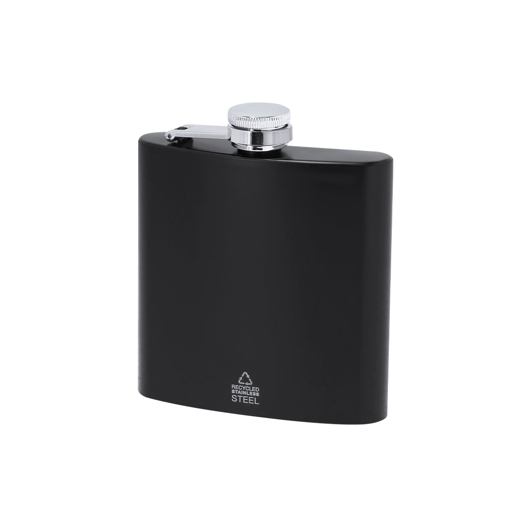 Petaca de 175 ml de capacidad con cuerpo de Acero Inox Reciclado y tapón de seguridad a rosca. De diseño ergonómico para guardar cómodamente en el bolsillo y cuerpo en acabado mate. Con distintivo de Acero Inox Reciclado.El acero es uno de los materiales más demandados y que puede encontrarse casi en todas partes, desde productos de uso diario a grandes construcciones. Con innumerables propiedades, entre las que cabe destacar la durabilidad y su alto grado de reutilización, convirtiéndolo en una alternativa muy valorada en soluciones de sostenibilidad. Debidamente tratado, permite obtener nuevos recursos de infinita utilización.