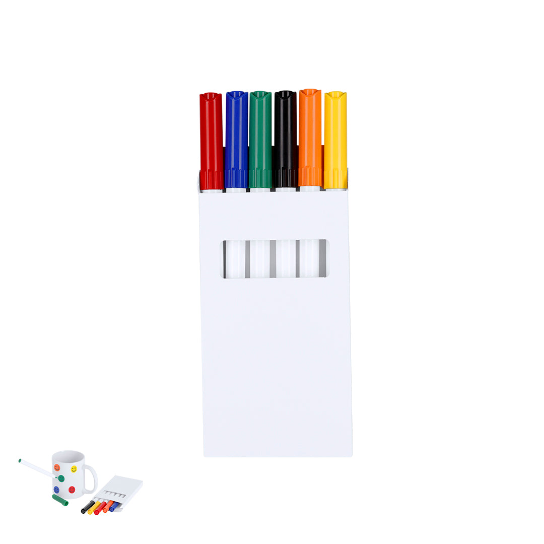 Set de 6 rotuladores en variados colores, diseñados para crear diseños únicos directamente sobre cerámica. Fácil de usar, permite infinitas posibilidades de personalización en casa, fijando los diseños con un horno convencional. Incluye instrucciones de uso detalladas en el reverso de la caja.