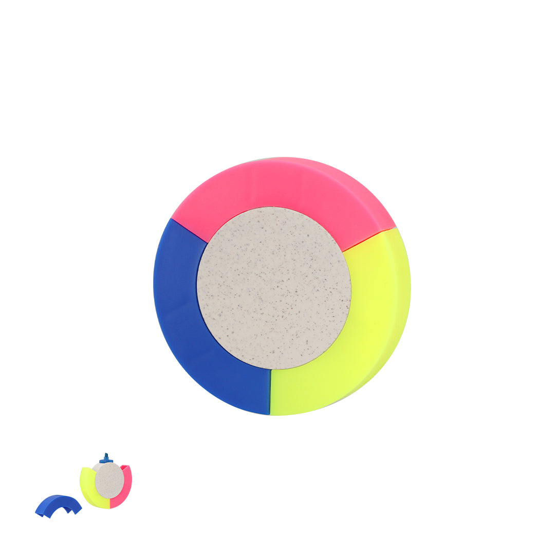 Original marcador fluorescente de tres colores fabricado en caña de trigo. Con cuerpo circular en suave acabado mate, especialmente diseñado para marcaje a todo color. Con capuchas a juego con el marcador. La caña de trigo fomenta la utilización de materias primas naturales, reduciendo así las emisiones contaminantes.