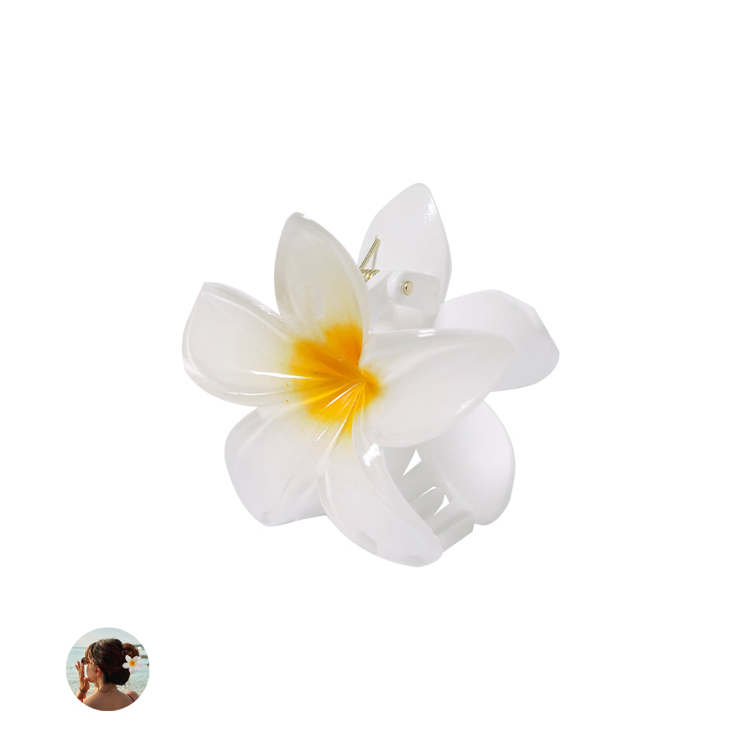 Pinza para el pelo con diseño original en forma de flor blanca y centro amarillo. Cuenta con 8 resistentes dientes que garantizan una sujeción cómoda y segura.