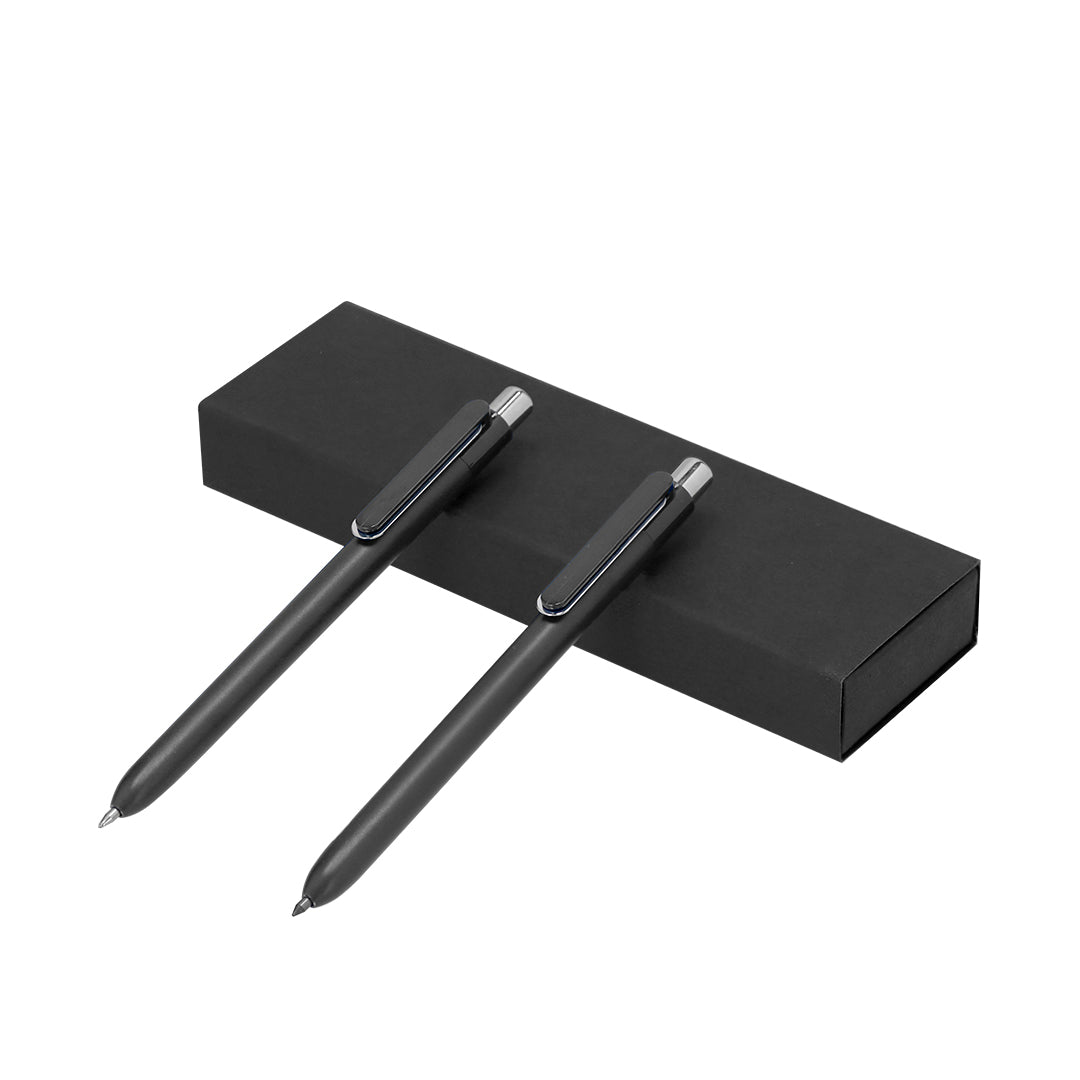 Set compuesto por un bolígrafo de tinta azul y un lápiz eterno, ambos fabricados en RABS. El lápiz eterno ofrece escritura continua, evitando generar residuos, y ambos cuentan con mecanismo pulsador. Diseñados con clip a juego y detalles cromados. Presentados en estuche de cartón reciclado de color negro. Con distintivo de RABS impreso.