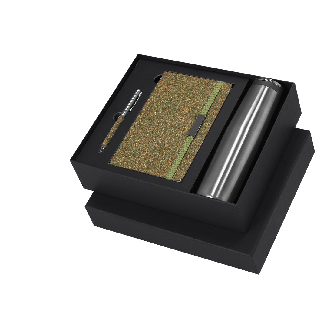 Set de bloc de notas y bolígrafo confeccionados con Fibra de Té, además de un bidón térmico fabricado en acero inox.El set incluye:- Bloc de notas de tapas rígidas, con 80 páginas rayas, banda elástica con clip metálico y marcapáginas a juego. - Bolígrafo de aluminio en acabado cromado con empuñadura de Fibra de Té, mecanismo giratorio y tinta azul. - Bidón térmico de doble pared fabricado en acero inox de 500ml. Con tapón a rosca y asa metálica. Bloc con logo Tea Grounds marcado en la parte posterior. Presentado de manera elegante en una caja negra con interior troquelado. Tea Grounds es un material sostenible creado a partir de residuos de hojas de té recicladas. Durante el procesamiento del té, se recolectan y compactan los restos para darles una segunda vida como recurso útil. Su producción fomenta la economía circular y reduce el impacto ambiental.