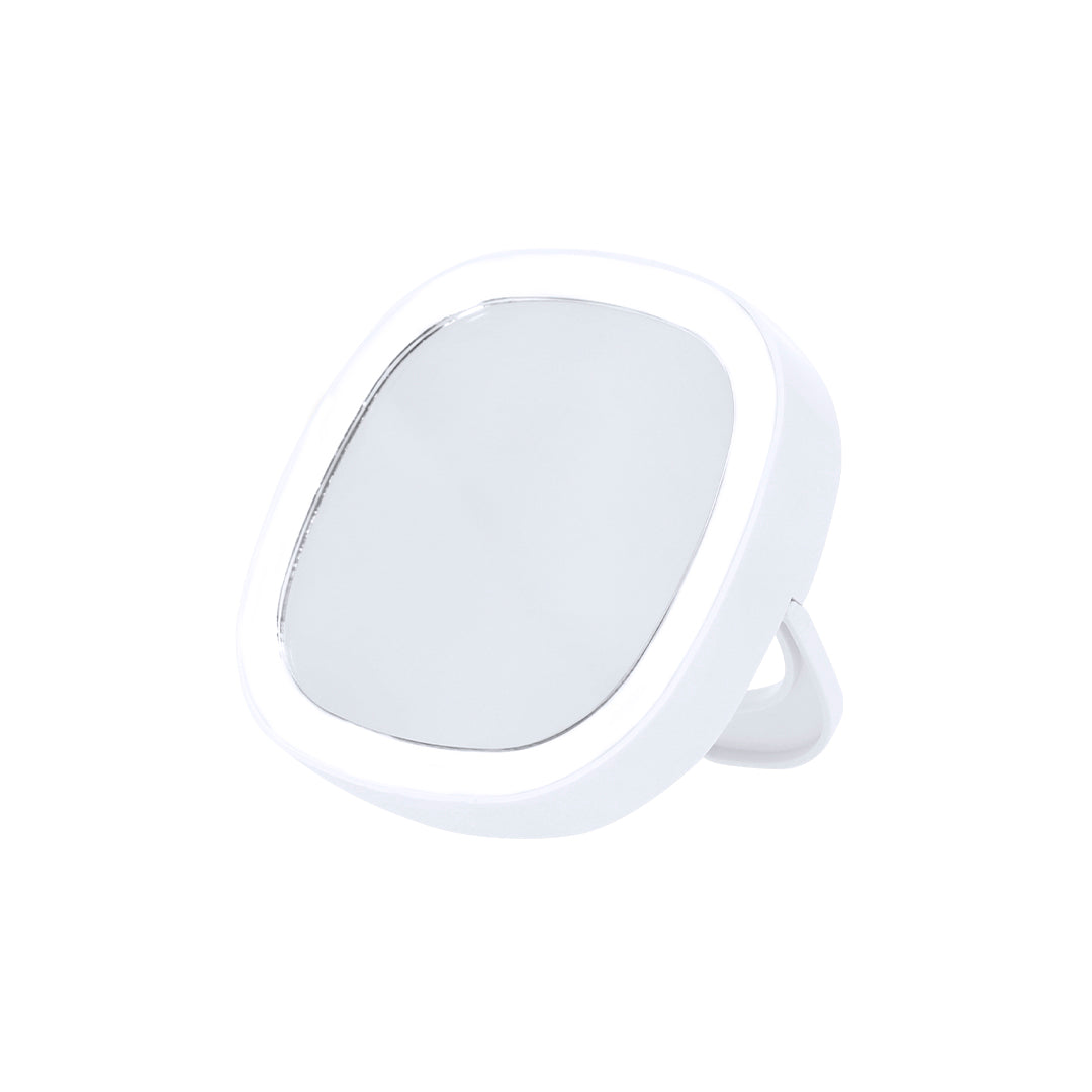 Espejo plegable con luz. Con 2 posiciones de luz regulables y soporte en parte trasera. Con aumento 1x. Incluye botón ON/OFF en parte delantera. Alimentación a pilas -3xAAA- no incluidas. Su diseño compacto y plegable facilita su transporte.