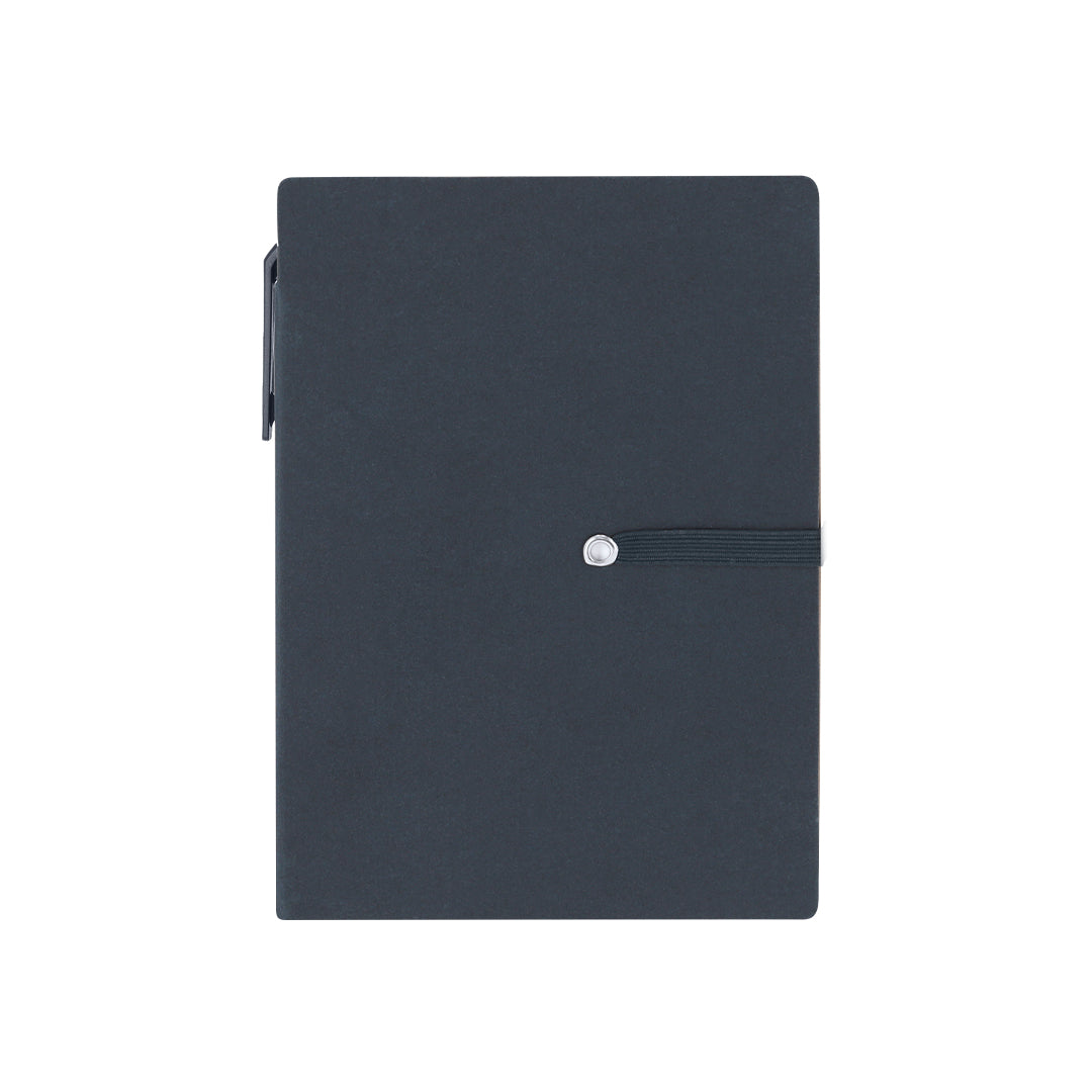 Bloc con notas adhesivas en cartón reciclado. Con tapas rígidas, incluye bloc de 70 hojas blancas de disposición a una raya. En la cubierta interior de la portada incluye: 25 hojas adhesivas amarillas 6x3,8 cm, 25 hojas adhesivas amarillas 7,5 x 9 cm y 100 mininotas adhesivas de varios colores y práctico bolígrafo en cartón reciclado de tinta azul con sistema pulsador. Incluye cinta elástica a juego para asegurar cierre.
