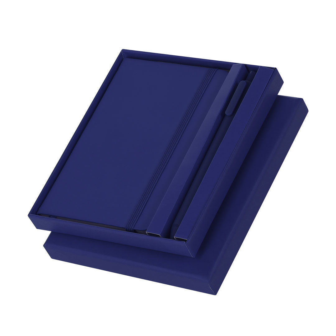 Set de bloc de notas y bolígrafo fabricados en PU. El set incluye: - Bloc de notas fabricado en PU. Incluye 80 páginas de color crema con líneas, marcapáginas y cinta elástica de cierre a juego. - Bolígrafo, con cuerpo en color sólido en acabado caucho. Dispone de clip, mecanismo pulsador y tinta azul.