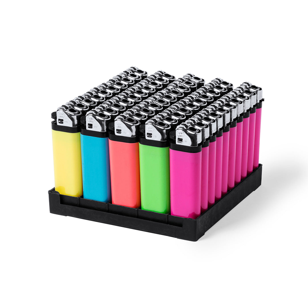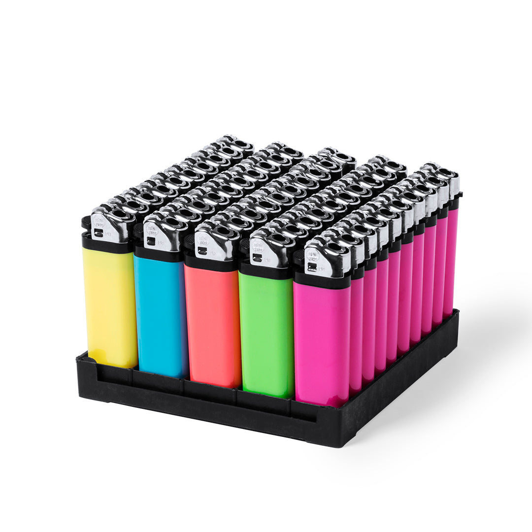 Encendedor a gas de mecanismo de piedra. Con protección infantil y regulador de llama. Servidos en bandejas expositoras de 50 unidades y en colores surtidos de acabado sólido.