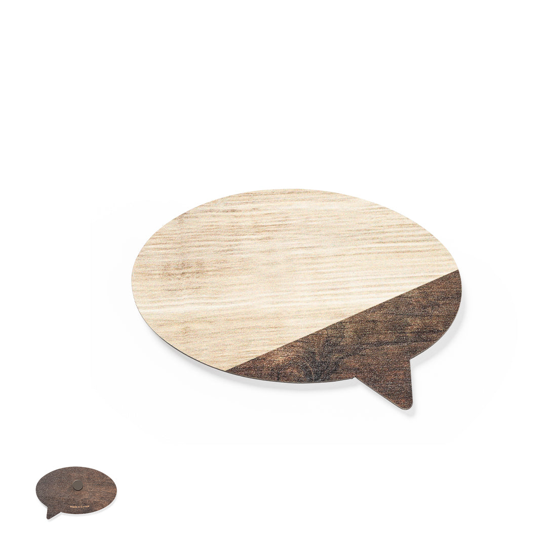 Original imán bocadillo fabricado en madera natural y de acabado bicolor. Amplia superficie de marcaje y distintivo Made In Europe.