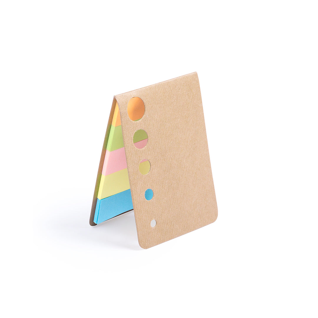 Bloc de notas adhesivas con tapa troquelada de suave tacto acabada en cartón reciclado. Con 100 mini notas adhesivas.
