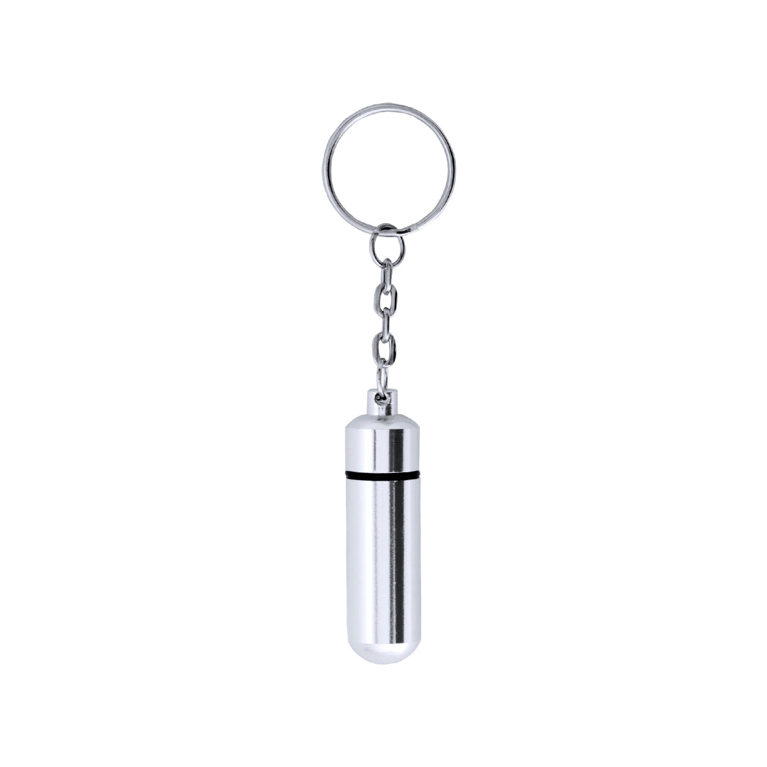 Llavero pastillero de discreto diseño con cuerpo en aluminio de acabado brillante y cierre a rosca.
