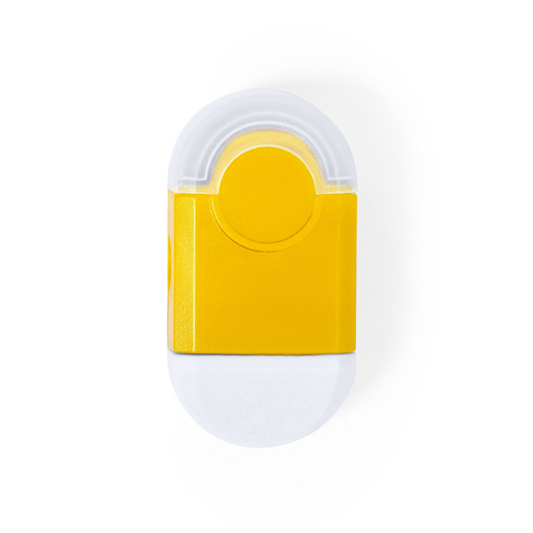 Set de goma y sacapuntas en vivos colores. Compartimento para residuos con capucha transparente.