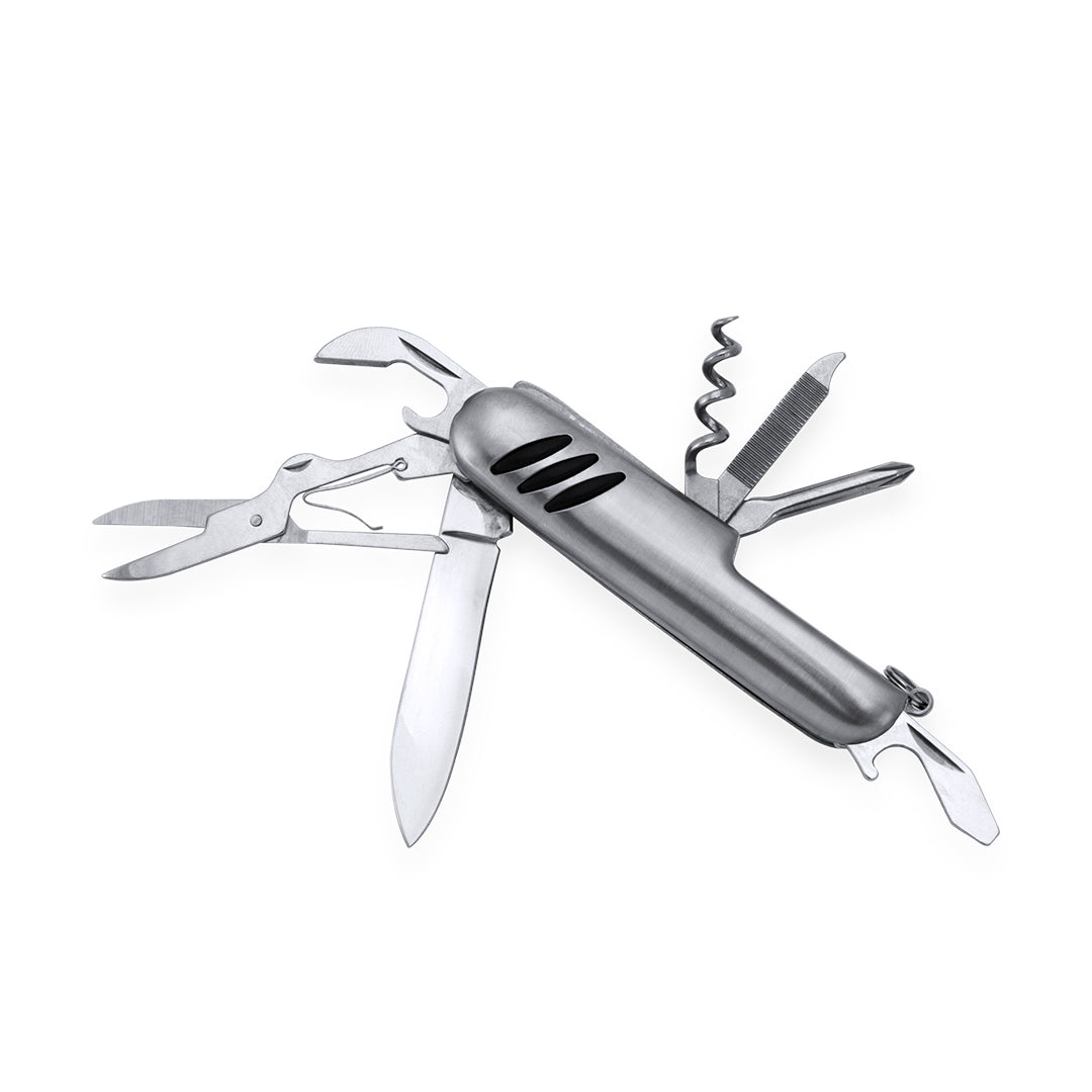 Navaja multiusos de acero inox de 10 funciones con empuñadura antideslizante. Incluye navaja, abridores, destornillador, lima, tijeras y anilla para llavero. Presentada en caja individual.