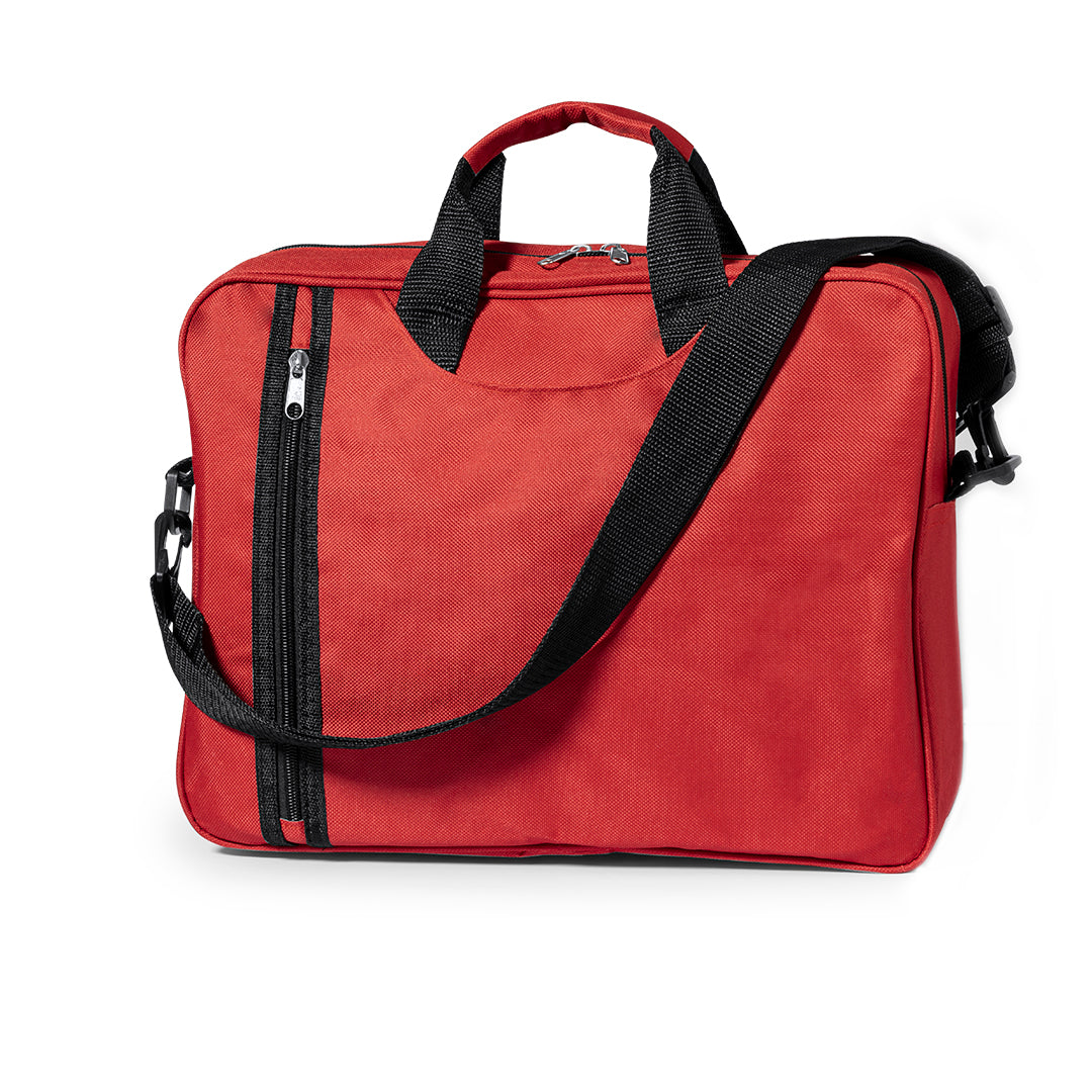 Portadocumentos de cierre de cremallera con original bolsillo frontal en vertical y compartimento bajo las asas en suave acabado de poliéster 600D en vivos colores. Con asas de transporte reforzadas a juego y cinta bandolera ajustable con cierres de mosquetón.