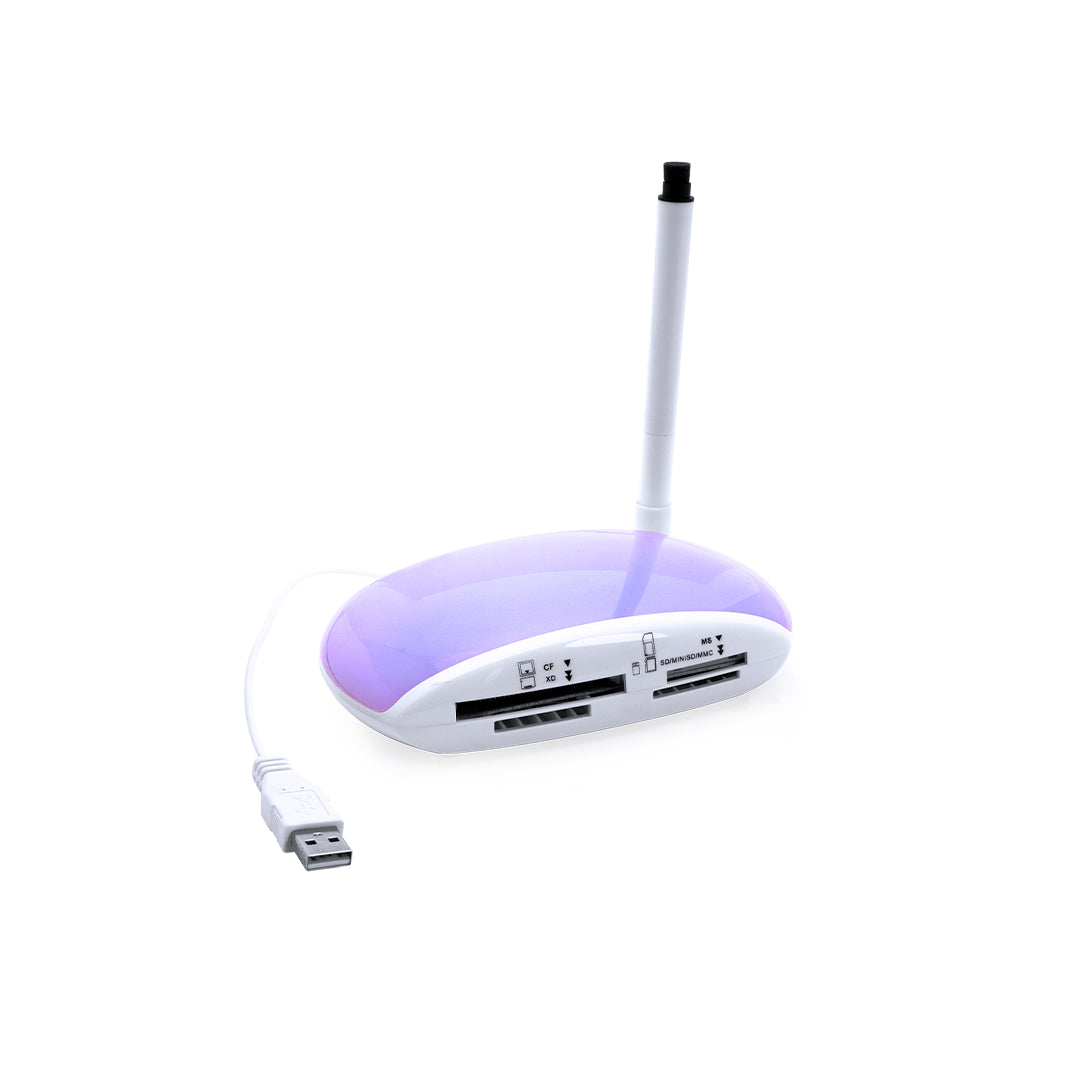 Original lector de tarjetas con original diseño curvado bicolor y tapa superior translúcida retroiluminada. Con rotulador para escribir mensajes en la parte retroiluminada y compatible con tarjetas SD, MiniSD,mmC, XD, XS, CF. Presentado en caja individual negra.