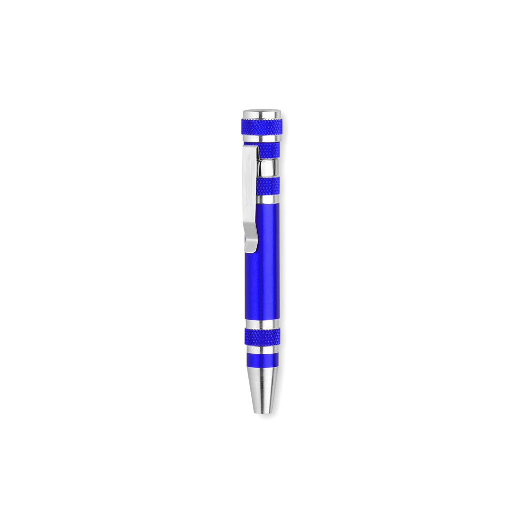 Multiherramienta de aluminio de 6 accesorios en variada gama de vivos colores metalizados. Con cuerpo anti deslizante y clip metálico. Incluye 6 cabezales destornilladores planos y de estrella.
