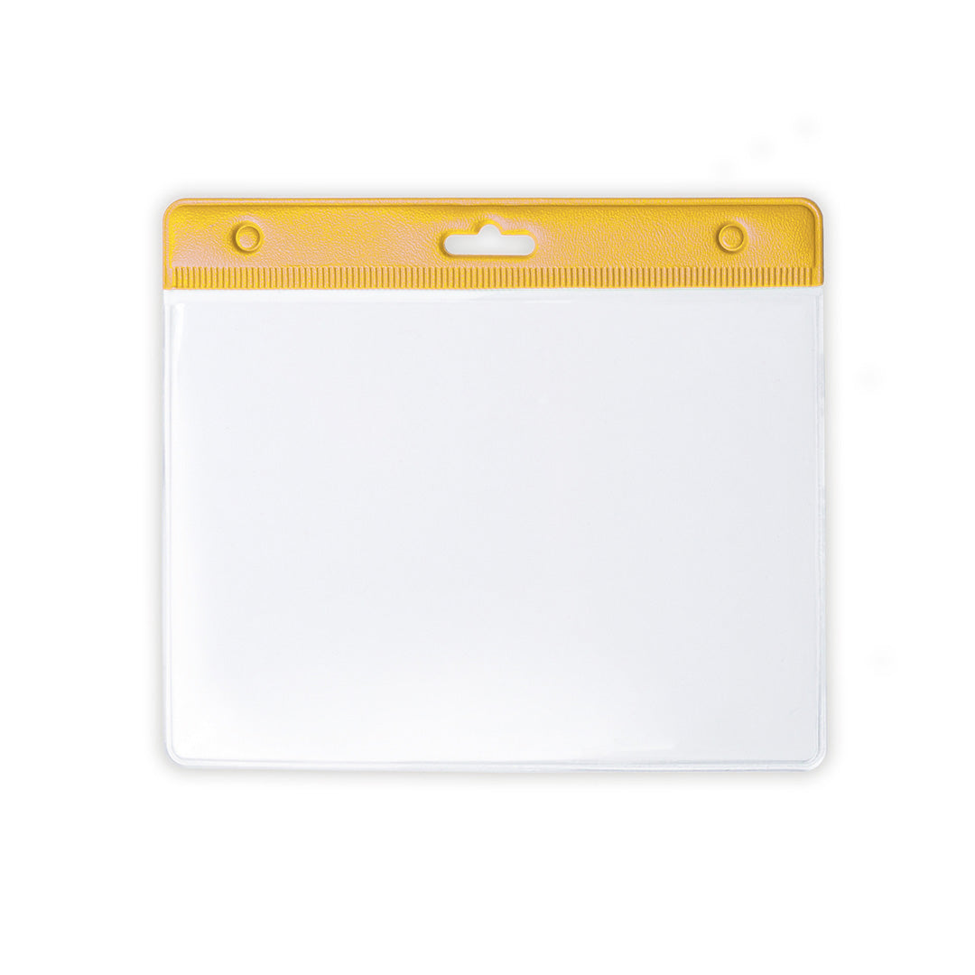 Identificador troquelado en PVC con cabecera en variados colores, ventana frontal transparente y parte trasera transparente.