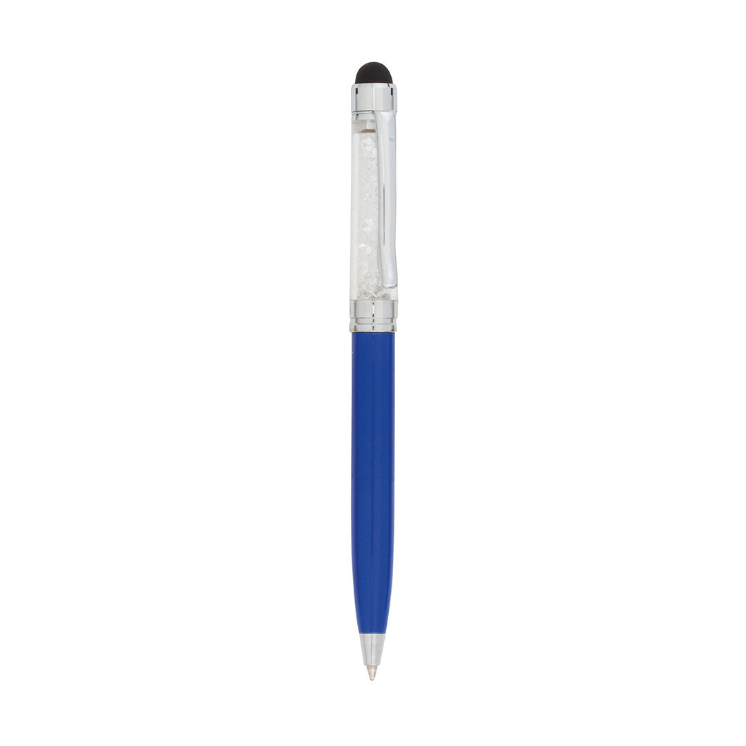 Original bolígrafo puntero de mecanismo giratorio con divertido líquido burbujeante en parte superior. Cuerpo metálico en suave acabado de vivos colores y accesorios en color plateado brillante. En tinta azul.