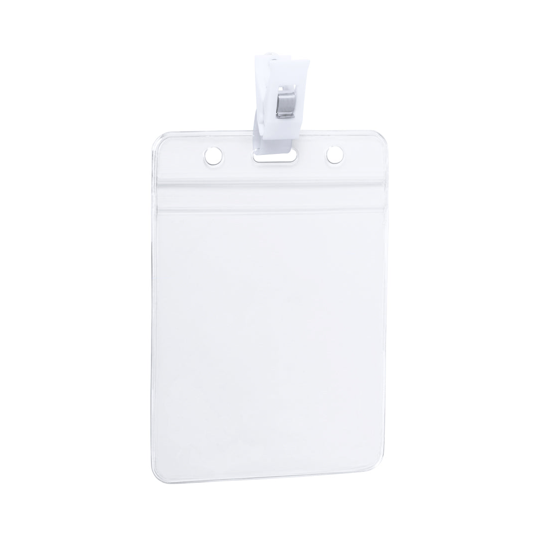 Identificador troquelado en PVC con clip de fijación en color blanco. Disponible en diseño horizontal y vertical.