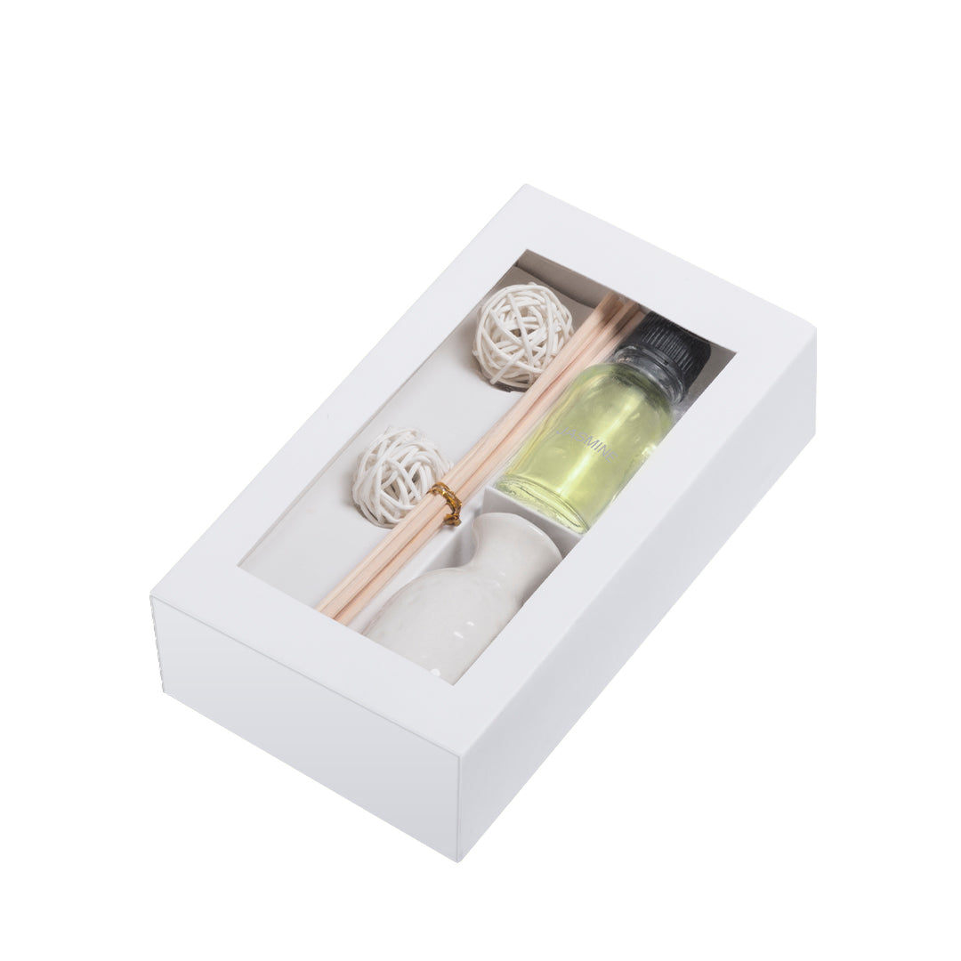 Difusor aromático de agradable aroma jazmín. Incluye tarro de fragancia en cerámica, palitos aromáticos y tarro de cristal de 15ml con fragancia. Presentado en estuche individual con compartimentos independientes y ventana.