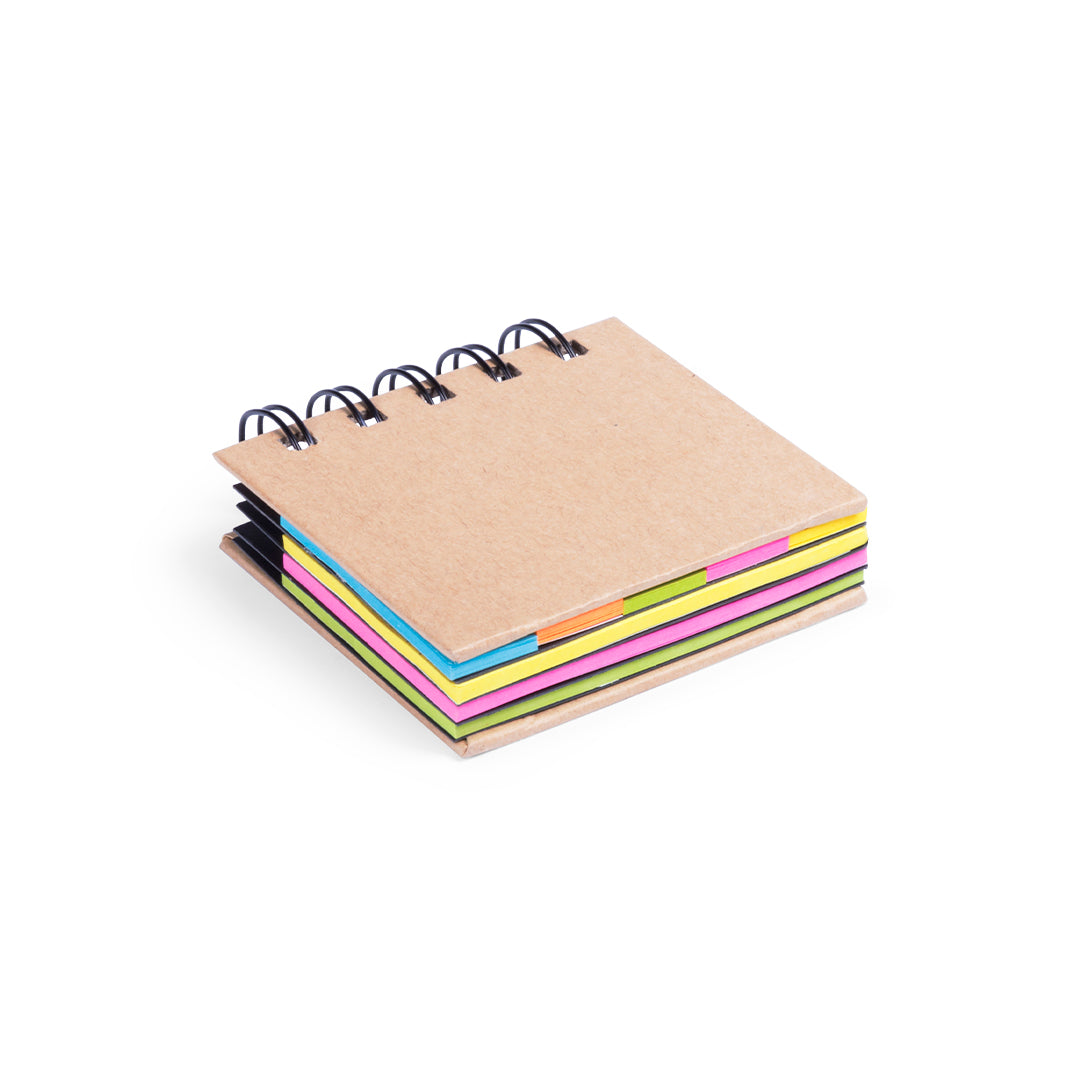 Bloc de notas adhesivas de anillas con tapas de suave tacto acabadas en resistente cartón reciclado rígido. Con 75 notas adhesivas grandes y 125 mini notas adhesivas.
